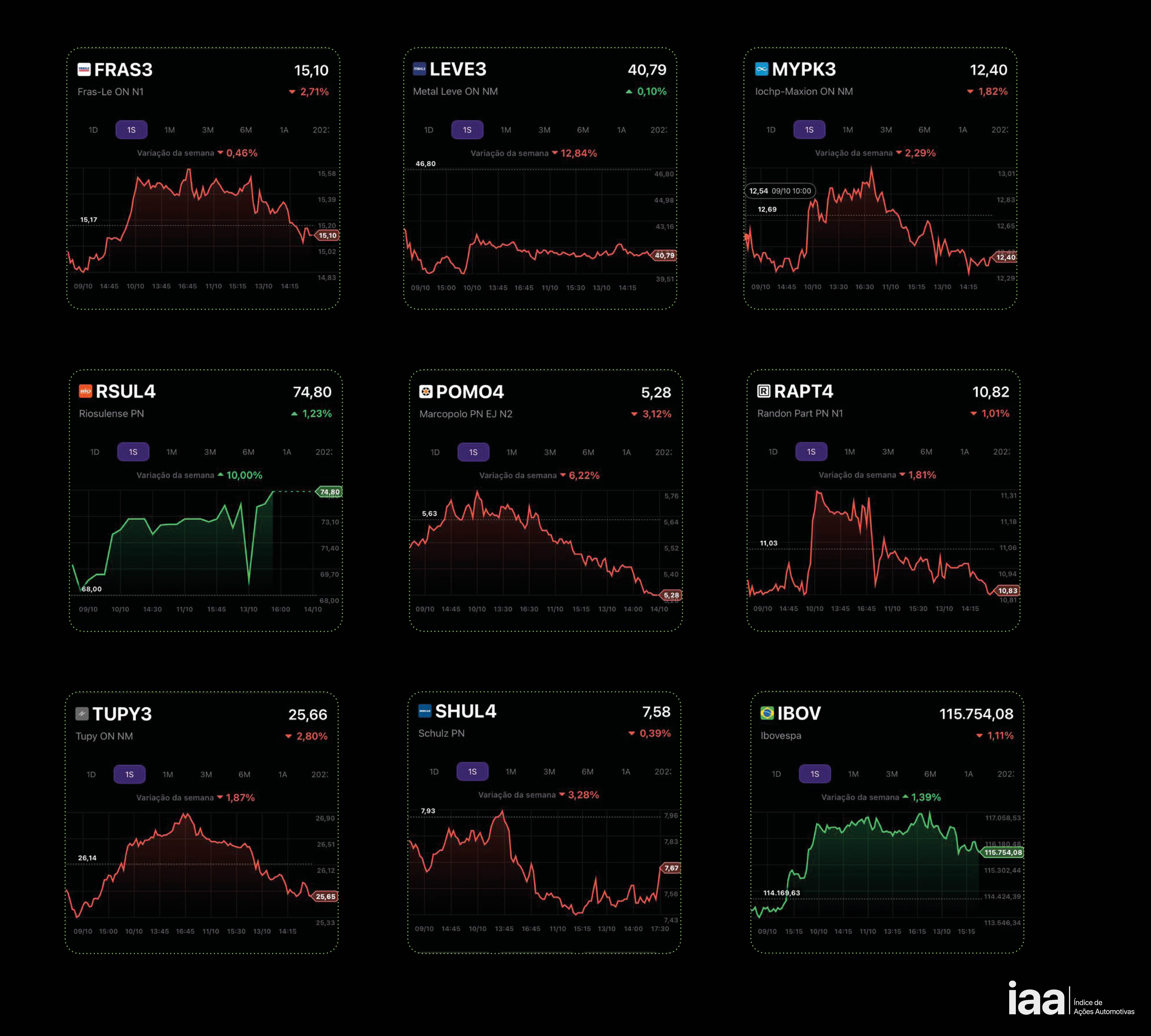 Todas as ações automotivas, com exceção as da Riossulense (RSUL4) que manteve o ritmo de crescimento da semana anterior e fechou o período com valorização de 10%, sofreram desvalorização.