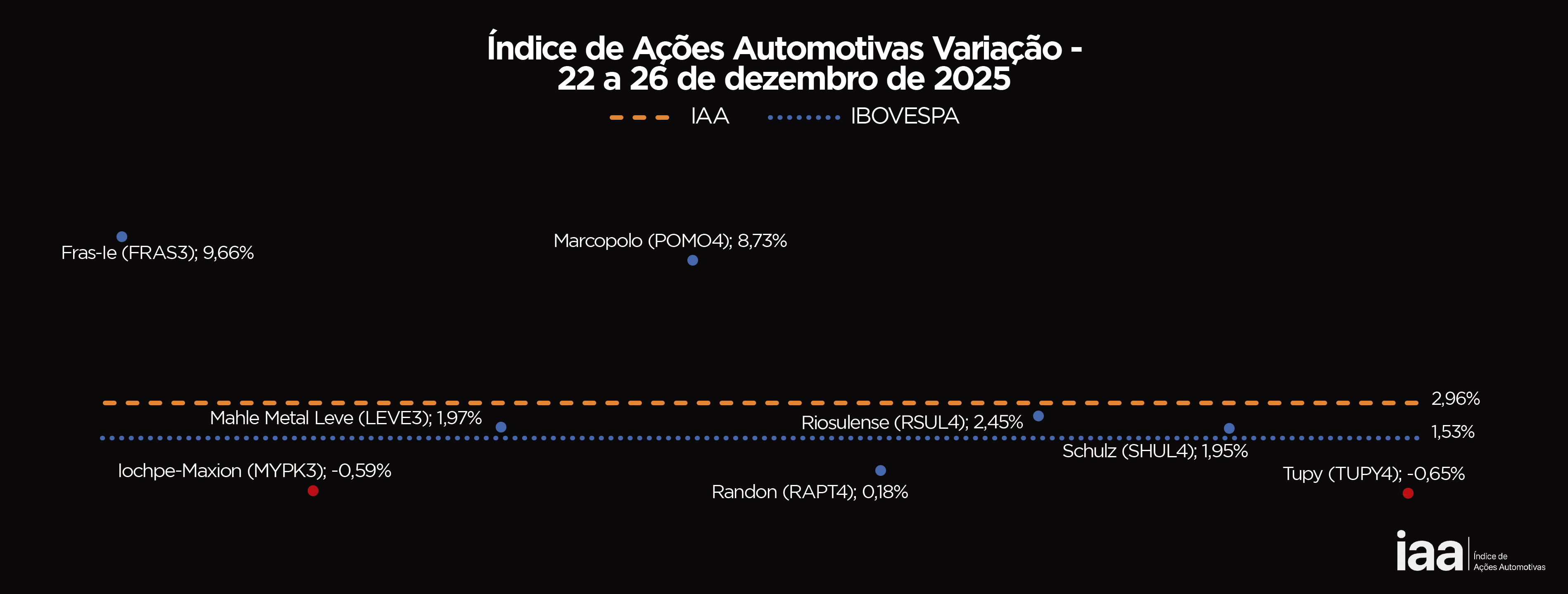 Em uma semana mais curta, por conta do feriado de Natal, as ações automotivas registraram resultados positivos. O IAA, que mede o desempenho da carteira automotiva ficou em +2,95%, superando o Ibovespa que fechou em +1,53%.