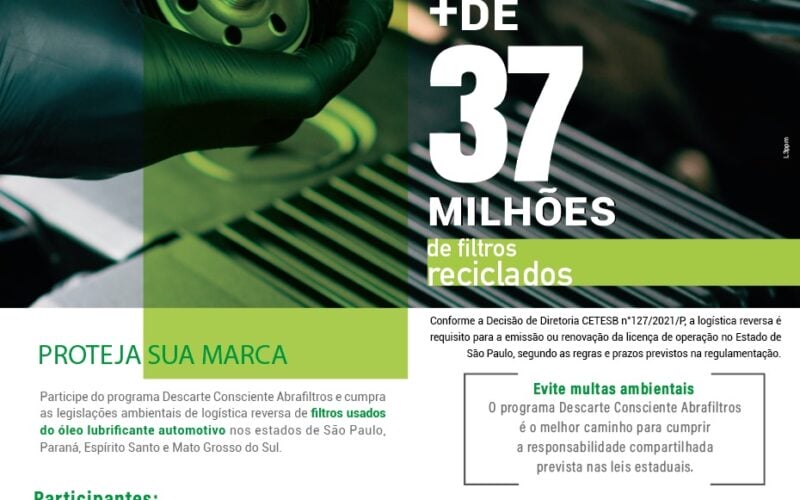 Criado pela Abrafiltros – Abrafiltros – Associação Brasileira das Empresas de Filtros Automotivos, Industriais e para Estações de Tratamento de Água, Efluentes e Reúso, em 2012, o programa Descarte Consciente Abrafiltros, que hoje está implantado em quatro estados – São Paulo, Paraná, Espírito Santo e Mato Grosso do Sul, já reciclou 37.185.502 filtros usados do óleo lubrificante automotivo até dezembro de 2023 representando 13.907.378 kg.