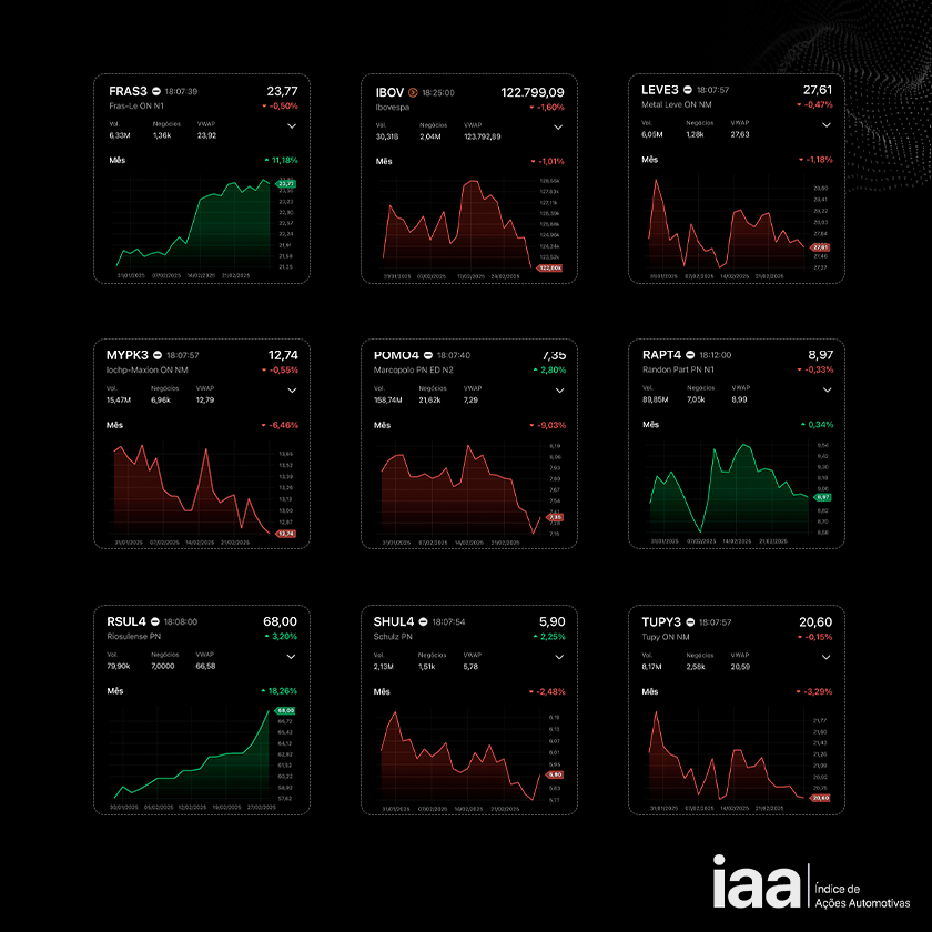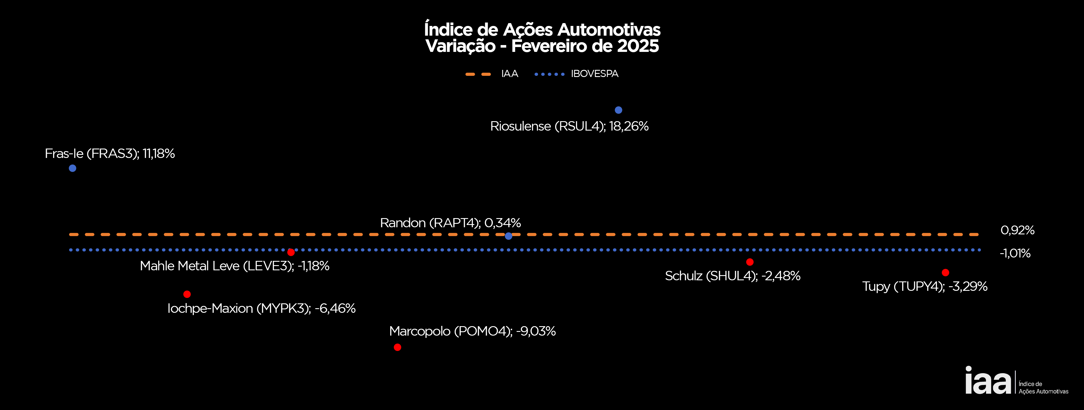Os papéis da Randon (RAPT4) mantiveram-se estáveis, com variação de +0,34%. Enquanto as demais ações automotivas que compõem o IAA registraram quedas no segundo mês do ano: Mahle Metal Leve (LEVE3) -1,18%; Schulz (SHUL4) -2,48%; Tupy (TUPY4) -3,29%; Iochpe-Maxion (MYPK3) -6,46% e Marcopolo (POMO4) -9,03%,