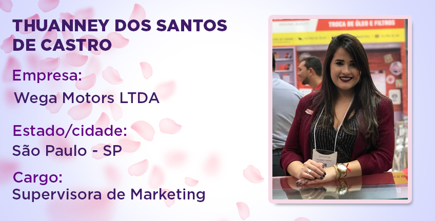 Thuanney dos Santos de Castro: Ser mulher no mercado de reparação automotiva é uma força vital múltipla, Energia, inteligência, coragem, medo, sensibilidade e vontade de seguir em frente estão presentes no mundo feminino ainda mais quando o setor onde atuamos é predominante por homens. É um orgulho para mim, ver mulheres crescendo nesse setor, mostra que o preconceito vem diminuindo, indústrias hoje quando vão fazer um processo seletivo não vê mais o gênero e sim o potencial da pessoa.