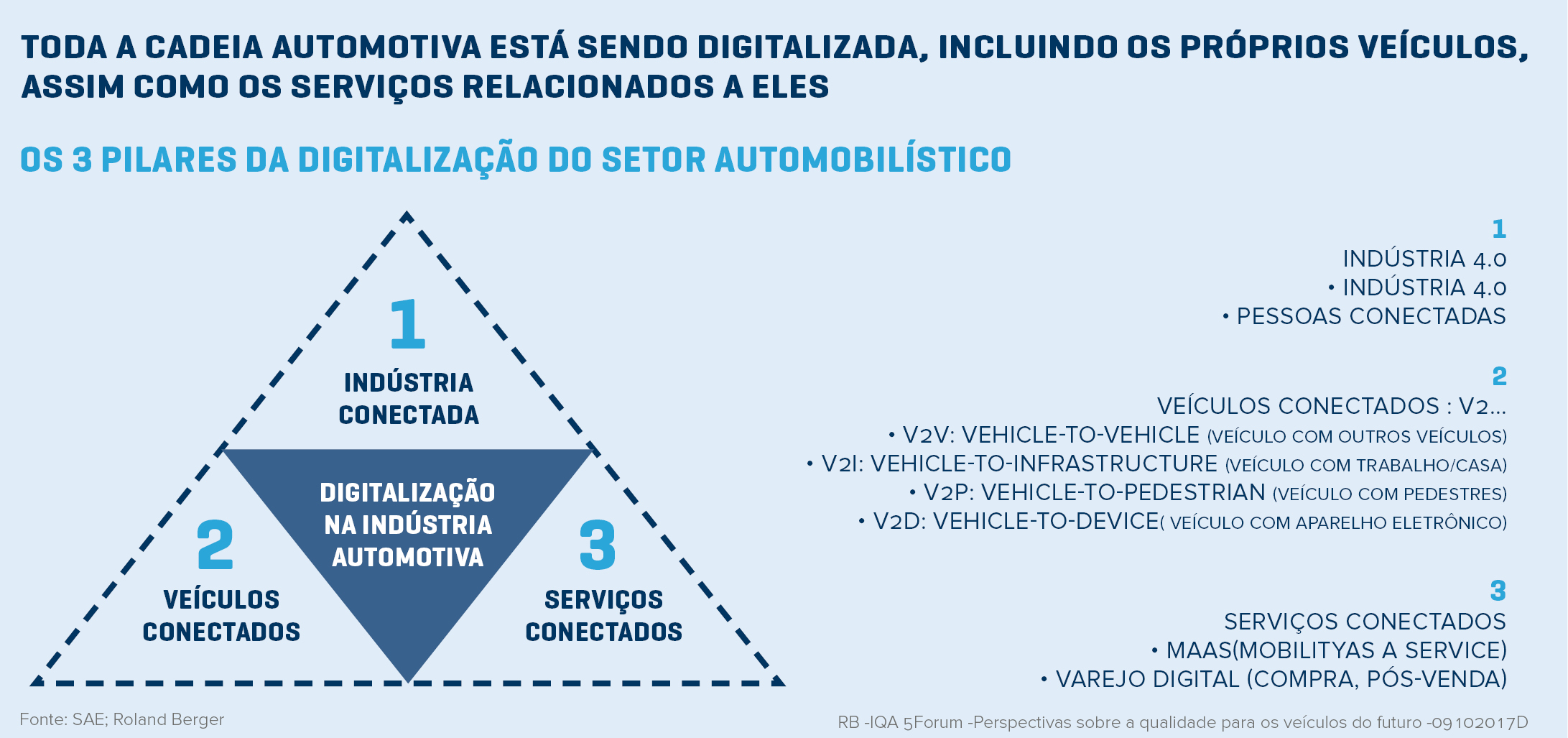 A terceira grande tendência para o setor apontada pela Roland Berger tem impacto direto no mercado de manutenção veicular. Trata-se da digitalização, que leva aos carros conectados. “As possibilidades são muito grandes com esse elemento de dados em tempo real, ou seja, os veículos oferecendo informações para as montadoras e vice-versa. E aí entra a possibilidade de uma montadora avisar o proprietário do veículo que um item vai falhar e que ele pode se dirigir a uma concessionária mais próxima onde encontrará uma promoção para aquele serviço específico”.