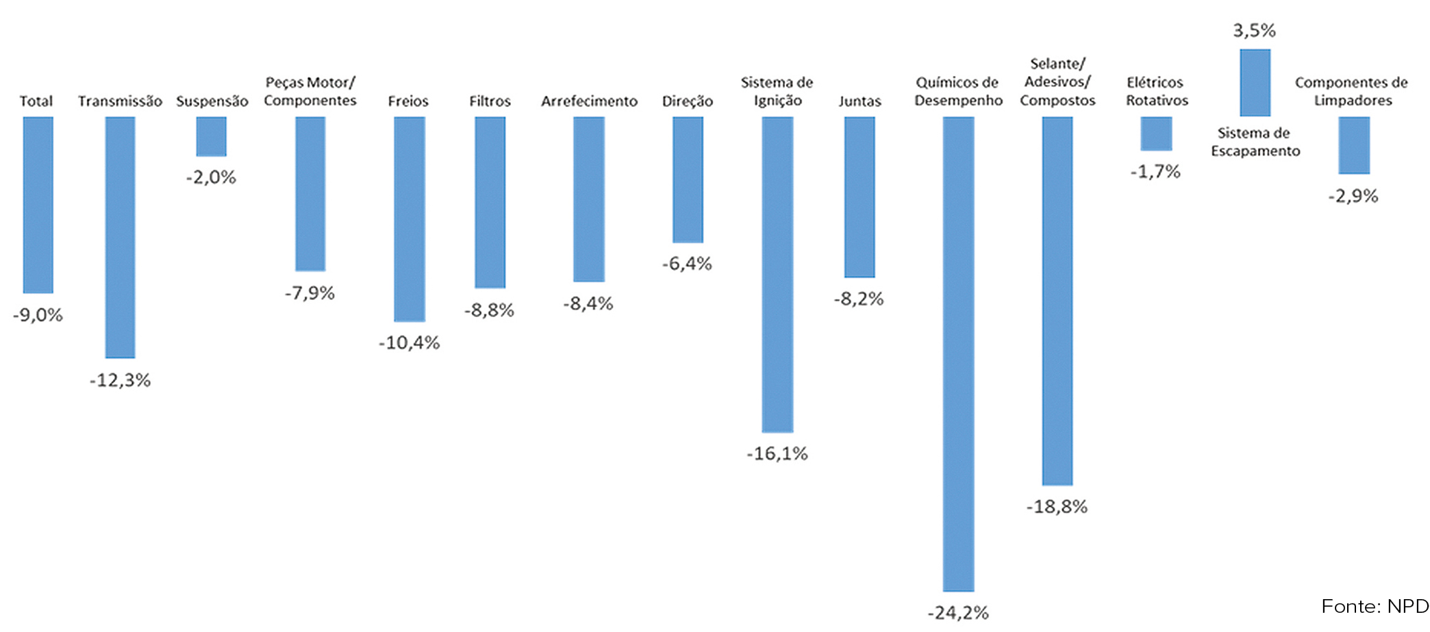 Das 14 categorias monitoradas mensalmente pela NPD no Brasil, apenas “Sistema de Escapamento” não sofreu perda de faturamento em agosto 2019. E quase todas apresentaram redução nas unidades comercializadas, exceto o grupo de produtos de “Elétricos Rotativos”, que também tiveram redução nos preços de venda.