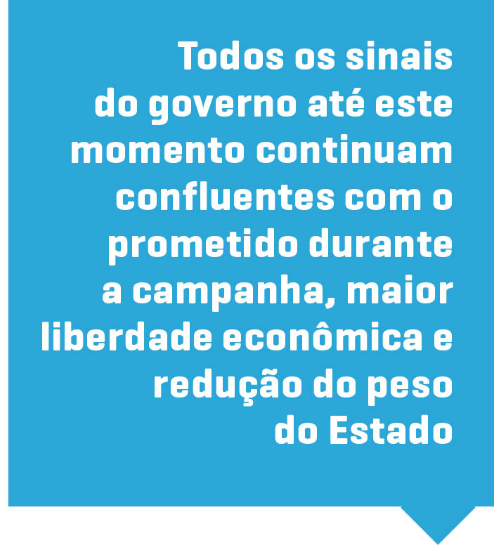 JV – Todos os sinais do governo até este momento continuam confluentes com o prometido durante a campanha, maior liberdade econômica e redução do peso do Estado. Há objeções, principalmente de um parlamento que passou muito tempo acostumado com um Estado grande, patrono e inchado; porém, as perspectivas no sentido do Estado deixar de ser um dificultador e se tornar um facilitador da economia estão corretas.