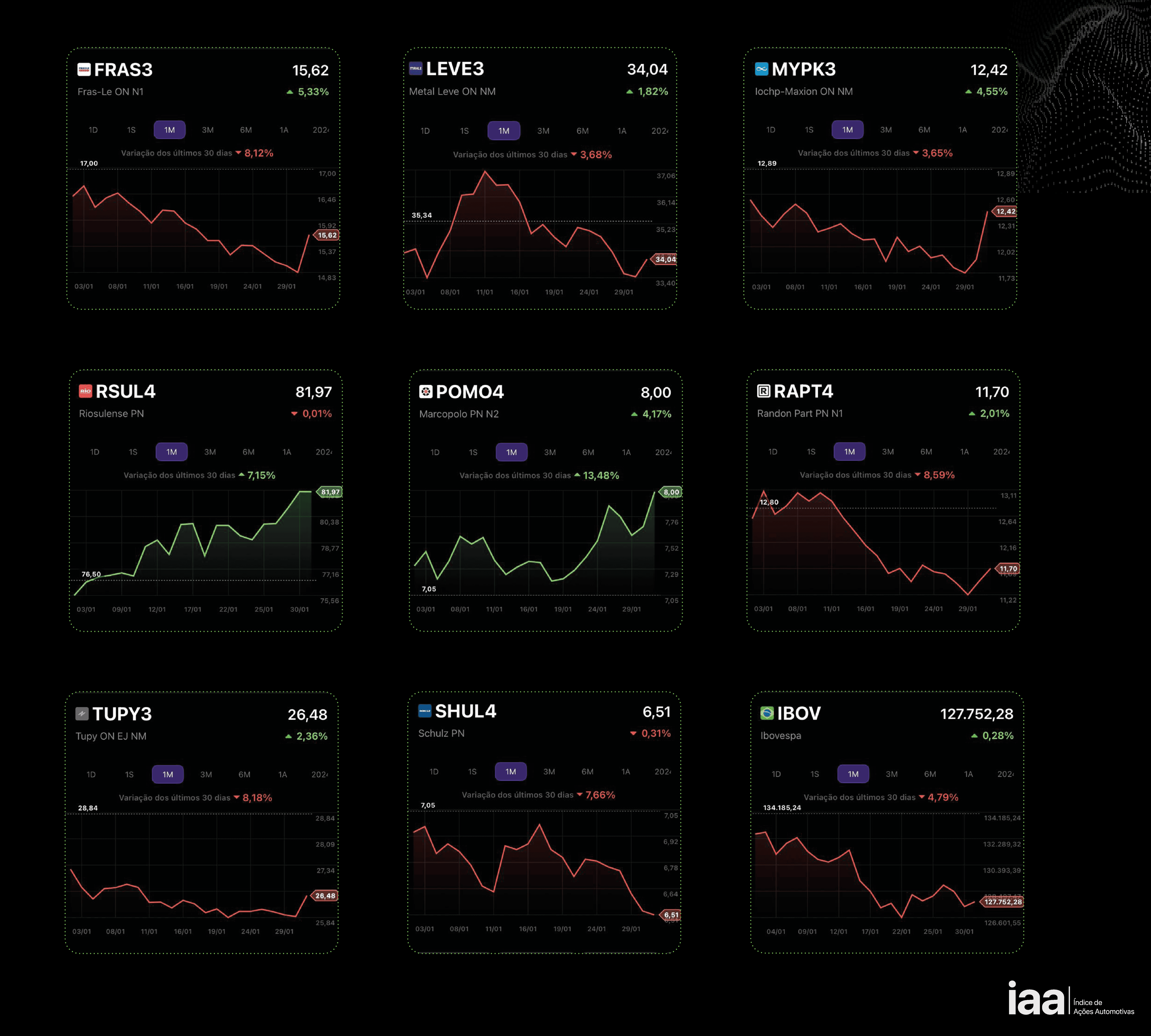 No mês, as ações da Iochpe-Maxion (MYPK3) obtiveram uma variação de -3,65%, as da Mahle Metal Leve (LEVE3) -,3,68%; (SCHUL4) 7,66%; Fras-le (FRAS3) -8,12%; Tupy (TUPY4) -8,18% e Randon (RAPT4) -8,59%.