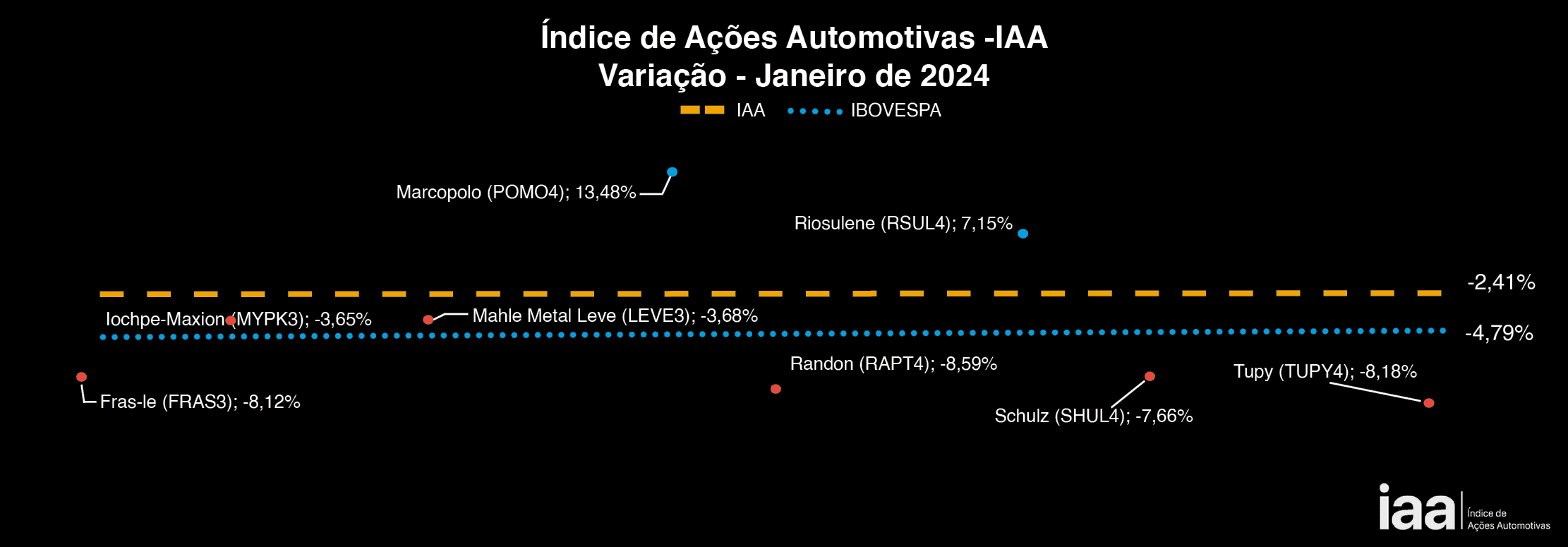 O primeiro mês do ano não transcorreu como esperado para os investidores da Bolsa de Valores de São Paulo, que obtiveram bons resultados em dezembro. O cenário externo, acompanhado da disputa de narrativas sobre a questão fiscal no Brasil, interferiram no desempenho das ações levando o ibovespa a fechar o mês em -4,79% e o IAA, índice que mede o desempenho das ações automotivas, em -2,41.