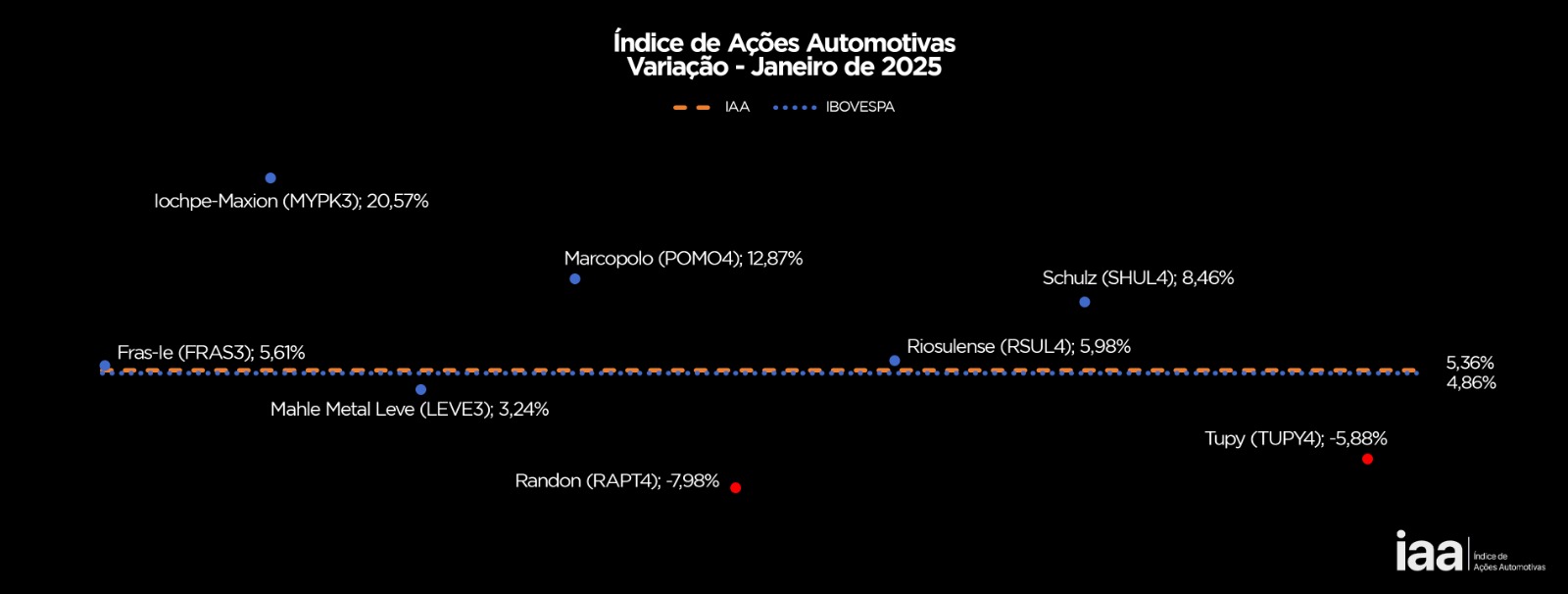 Entre as ações automotivas, o melhor desempenho foi o da Iochpe-Maxion (MYPK3) que cresceram + 20,57% no mês. Marcopolo (POMO4) 12,87%; Schulz (SHUL4)+8,46%;Riossulense (RSUL4) +5,98%; Fras-le (FRAS3) +5,61% e Mahle Metal Leve (LEVE3) +3,24%; também valorizaram no primeiro mês de 2025.