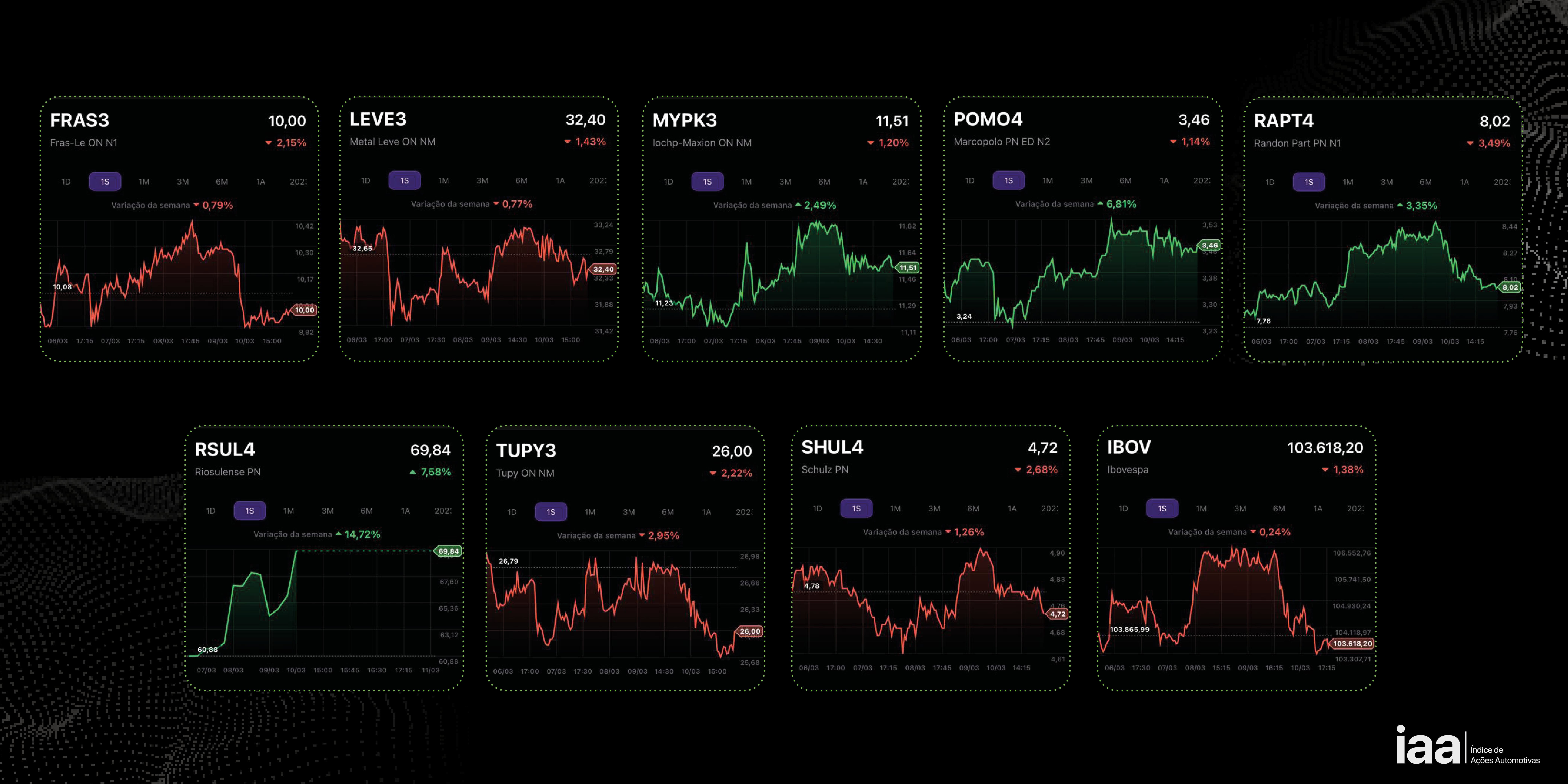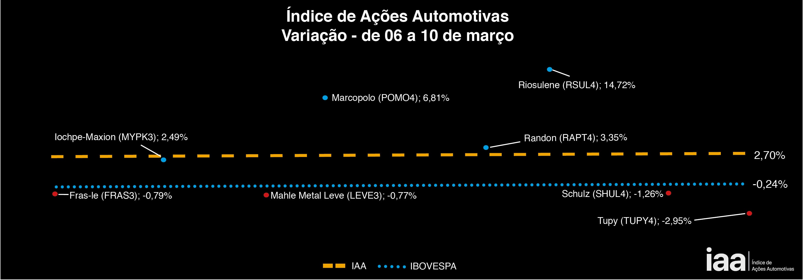 O IAA (Índice de Ações Automotivas) encerrou a semana de 06 a 10 de março com uma variação de 2,70%. Pela segunda semana consecutiva, o resultado positivo superou o iBovespa que fechou o período com queda de -0,24%.