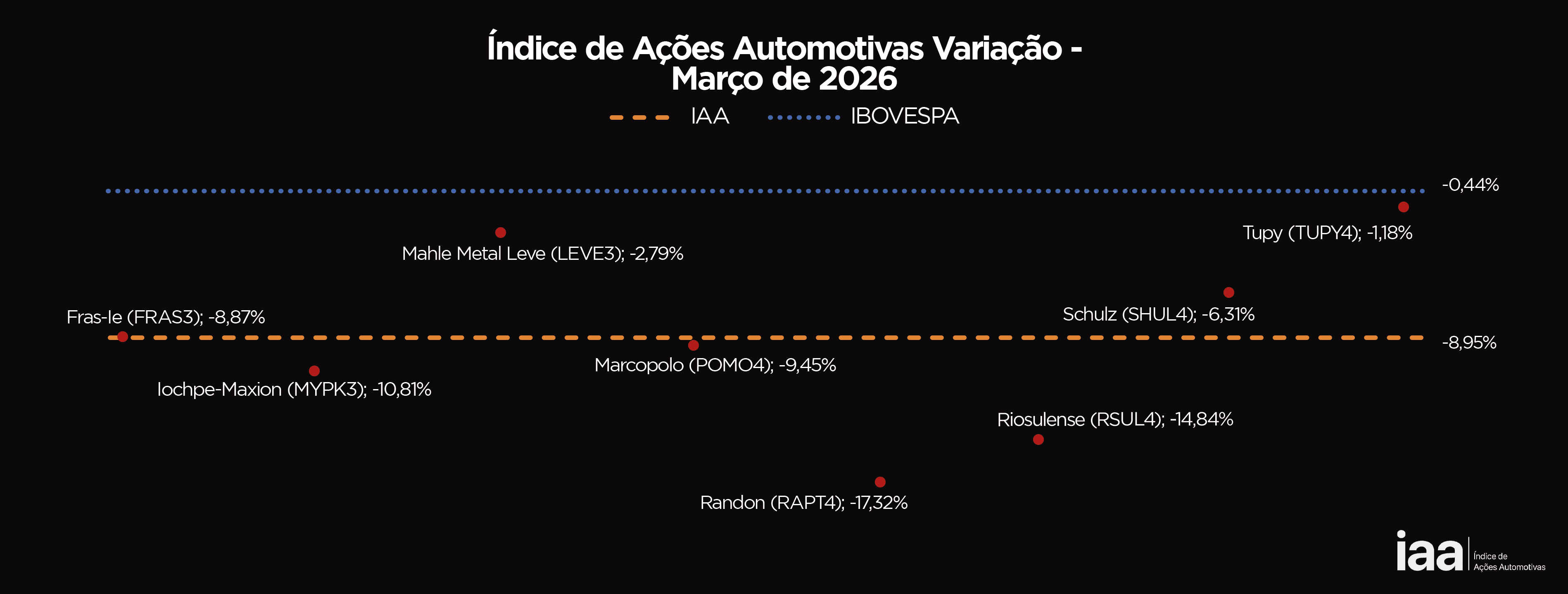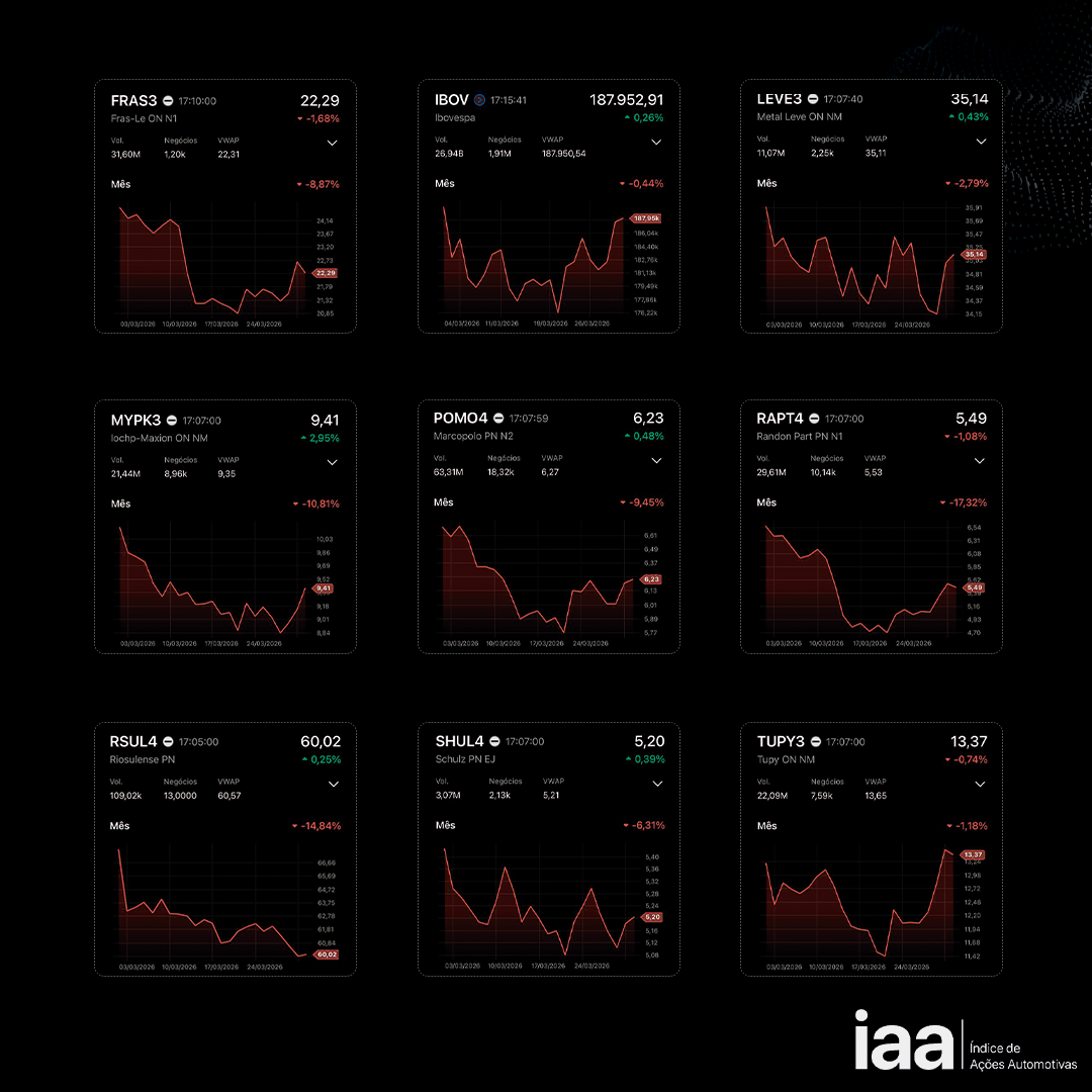 Ainda bem que acabou. Março de 2026 deverá ser lembrado, ou melhor, esquecido por quem investe na carteira automotiva como um mês de declínio no valor das ações automotivas, que sofreram sucessivas quedas provocadas pela instabilidade internacional com o conflito no Oriente Médio e também tímidos resultados da indústria de autopeças e equipamentos diante da entrada de produtos chineses no País. O IAA, índice que mede o desempenho dessas empresas na Bolsa de Valores de São Paulo acumulou perdas de -8,95%.