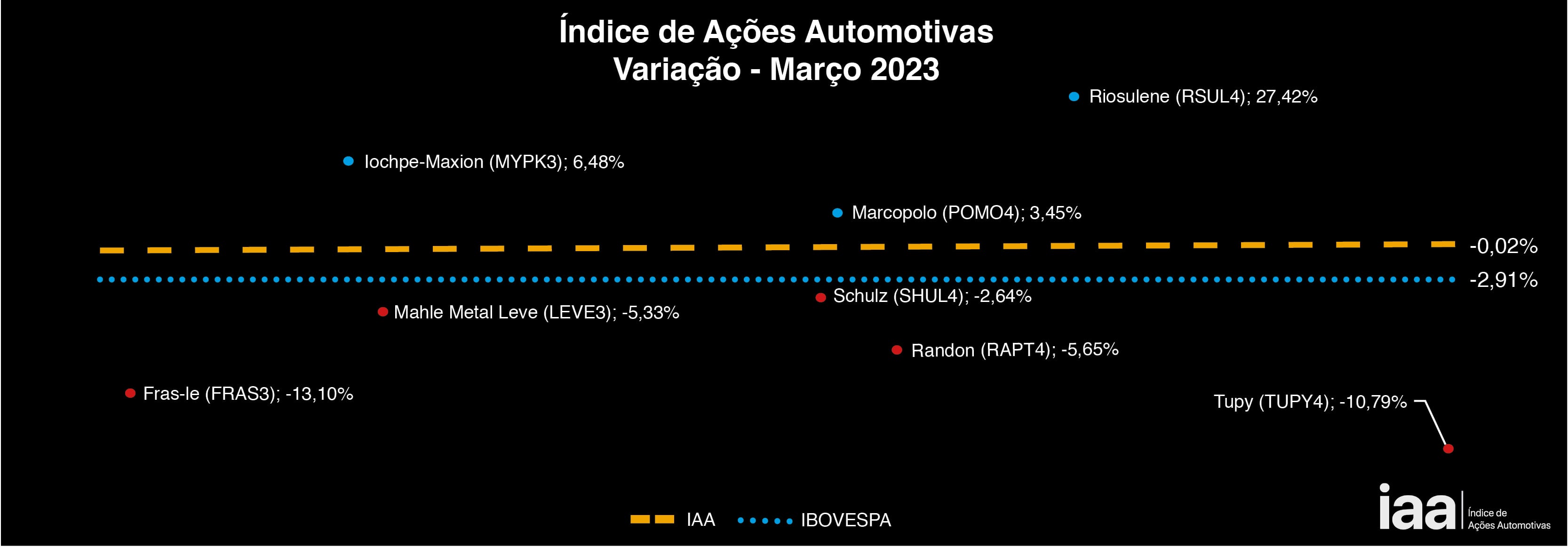 Entre as ações automotivas negociadas na Bolsa de Valores de São Paulo, as da Riosulense (RSUL4) foram as tiveram a melhor variação mensal com crescimento de 27,42%, seguidas pela Iochpe-Maxion (MYPK3) 6,48% e Marcopolo (OPOMO4) 3,45%.
