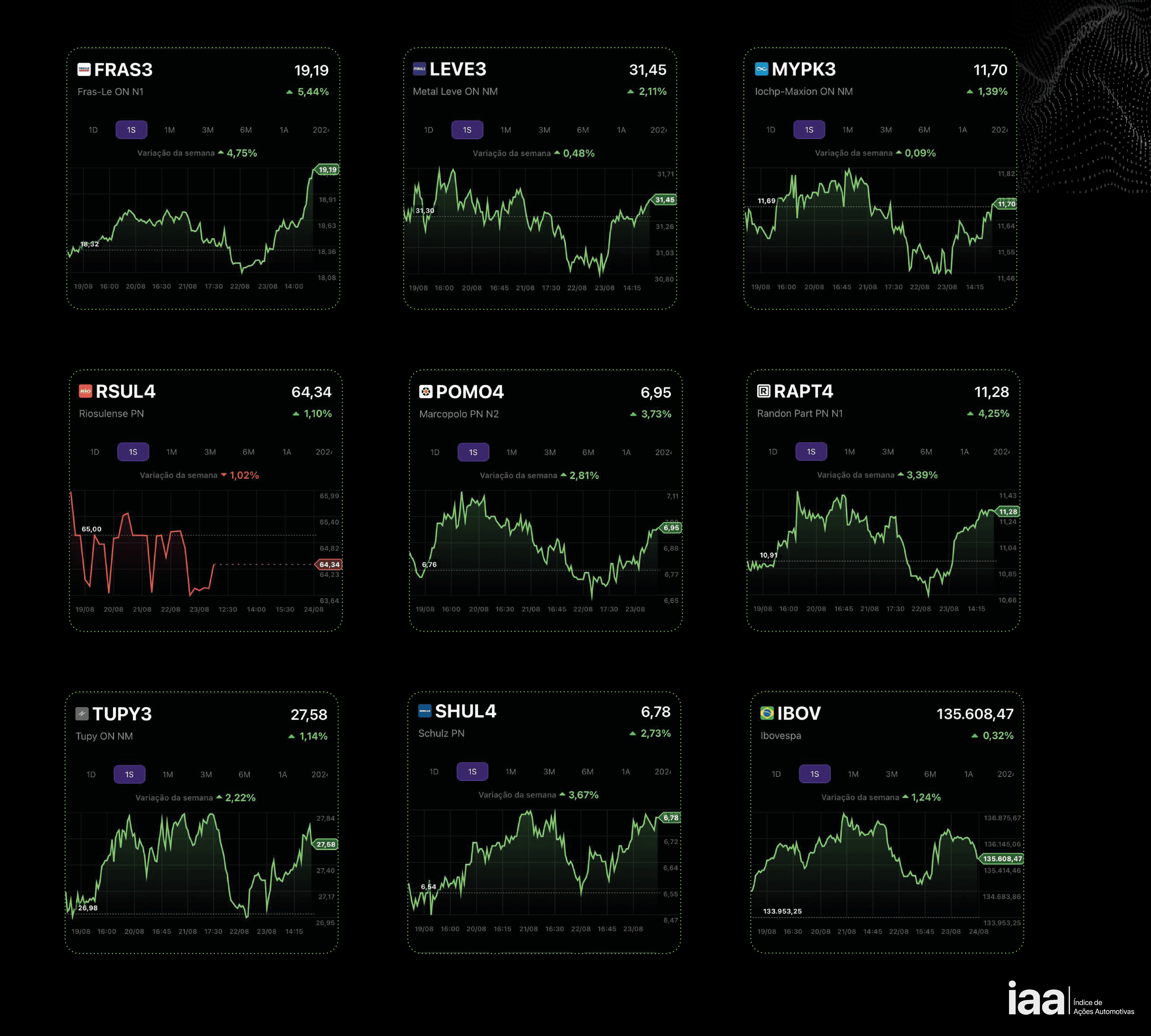 O IAA é o índice criado pelo After.Lab para medir as movimentações nas ações das empresas do setor automotivo listadas em Bolsa. Mesmo que ainda sejam poucas as empresas a operar nessa modalidade, já são suficientes para proporcionar uma leitura sobre o desempenho das operações relacionadas ao universo automotivo que abriram capital e usam o pregão do Ibovespa para conquistar investidores e alavancarem seus negócios.