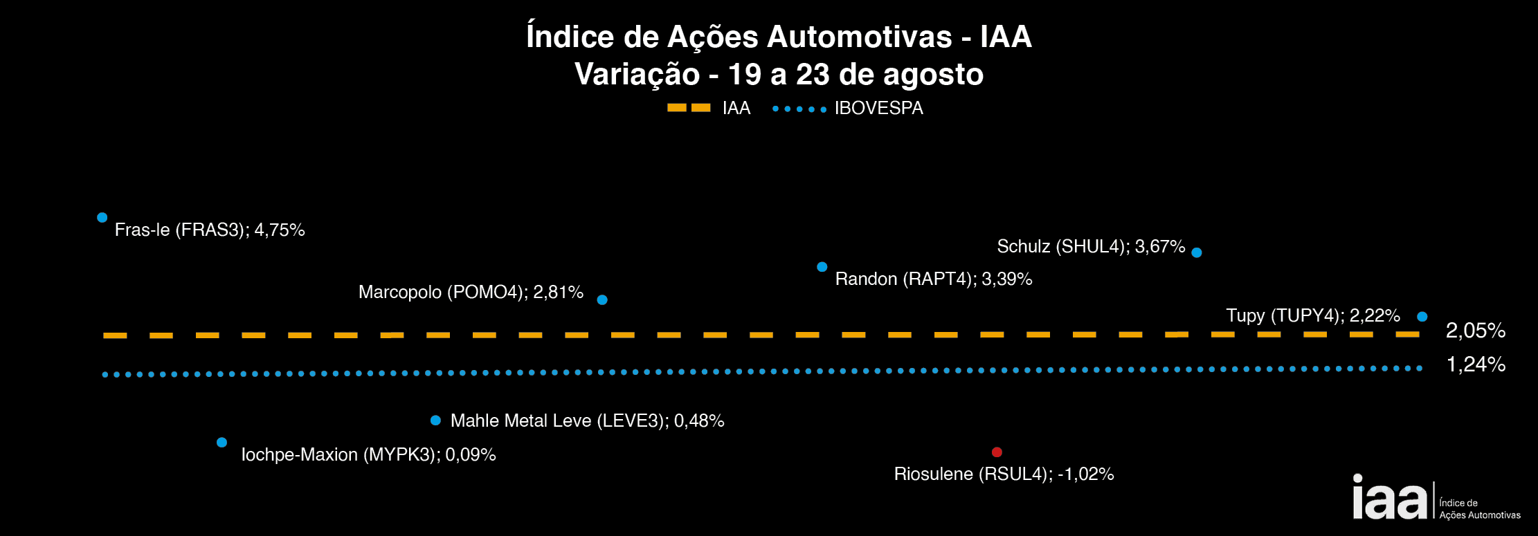 Com exceção às ações da Riossulense (RSUL4), que romperam um período de valorização e registraramm queda de -1,02%, todas os ativos do IAA obtiveram desempenho positivos. Fras-le (FRAS3) +4,75%; Schulz (SHUL4) +3,67%; Randon (RAPT4) +3,39%; Marcopolo (OPOMO4) +2,81%; Tupy (TUPY4) +2,22%; Mahle Metal Leve (LEVE3) -+0,48% e Iochpe-Maxion (MYPK3) +0,09%.