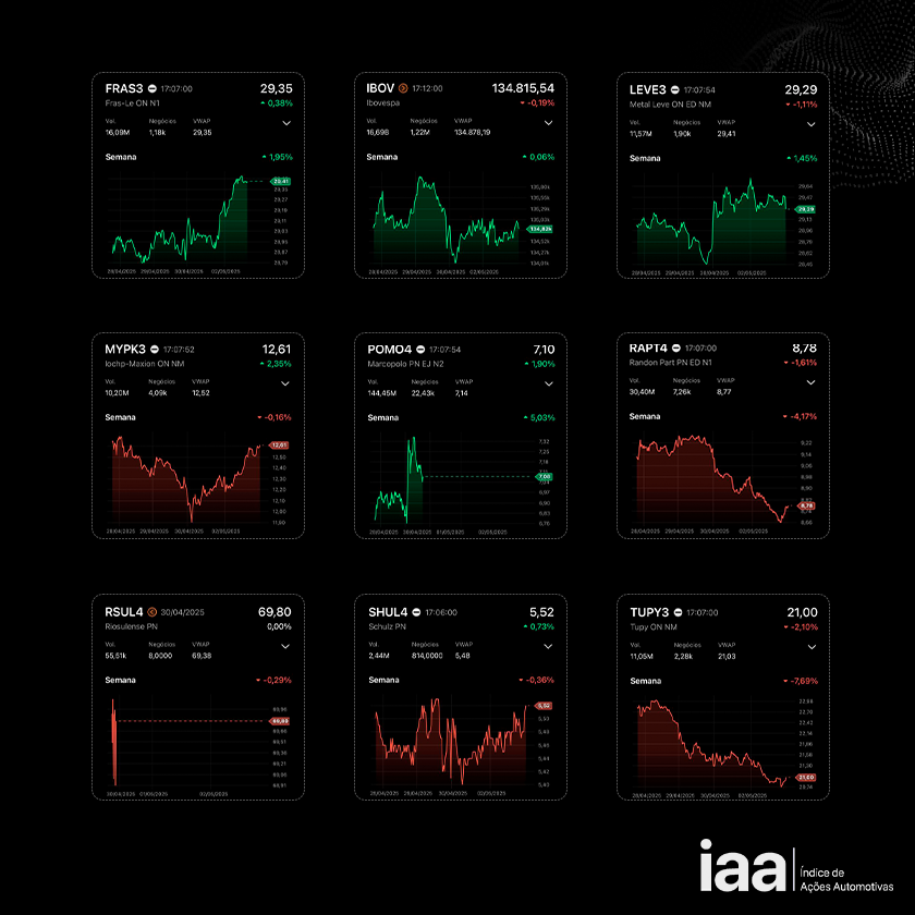O IAA é o índice criado pelo After.Lab para medir as movimentações nas ações das empresas do setor automotivo listadas em Bolsa. Mesmo que ainda sejam poucas as empresas a operar nessa modalidade, já são suficientes para proporcionar uma leitura sobre o desempenho das operações relacionadas ao universo automotivo que abriram capital e usam o pregão do Ibovespa para conquistar investidores e alavancarem seus negócios.