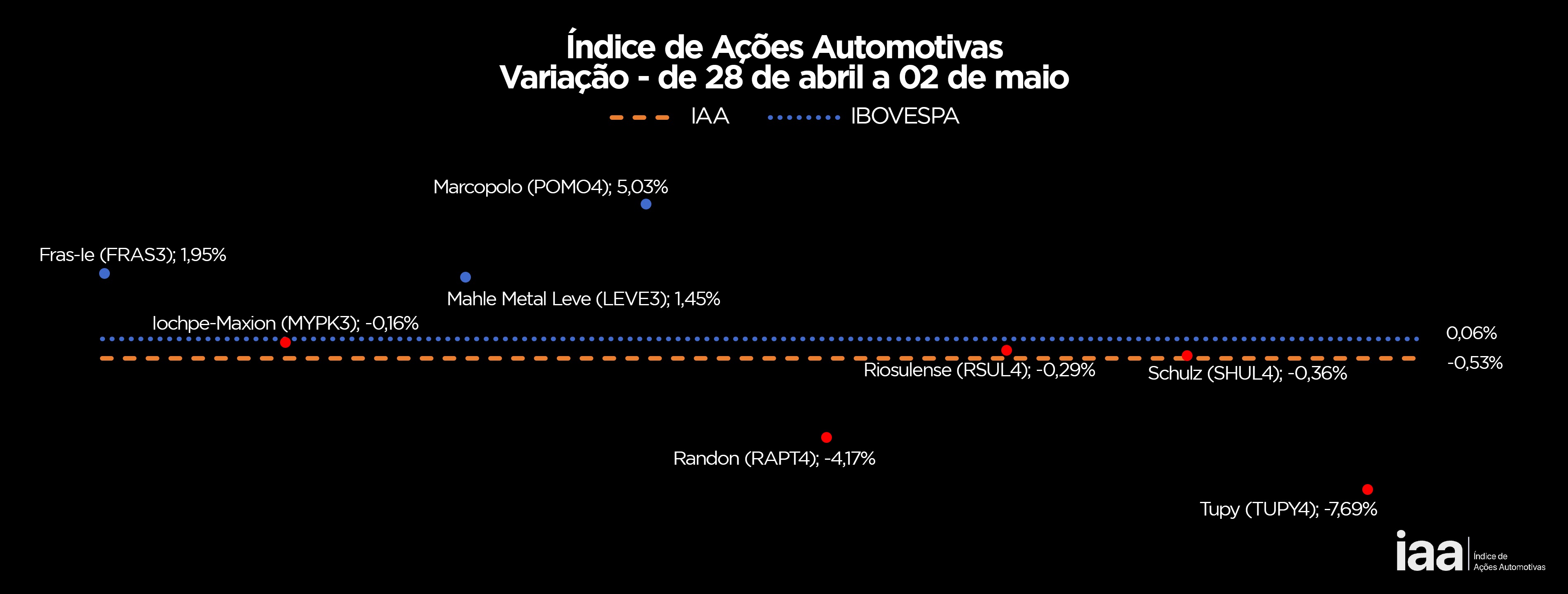 A semana de 28 de abril a 02 de maio contou com um dia a menos de pregão na Bolsa de Valores de São Paulo, já que o dia internacional do trabalho foi em uma quinta-feira, interferindo nos índices financeiros. Apesar do bom desempenho das ações da Marcopolo (POMO4) +5,03%; Fras-le (FRAS3) +1,95% e Mahle Metal Leve (LEVE3) +145%, o IAA encerrou o período no patamar negativo -0,53% resultado das quedas nos papeis da à Tupy (TUPY4) -7,69%; Randon (RAPT4) -4,17%; Schulz (SHUL4) -0,36%; Riosulense (RSUL4) -0,29% e Iochpe-Maxion (MYPK3) -0,16%.