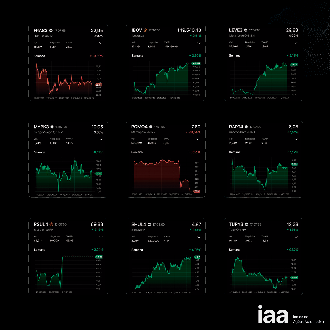 O IAA é o índice criado pelo After.Lab para medir as movimentações nas ações das empresas do setor automotivo listadas em Bolsa. Mesmo que ainda sejam poucas as empresas a operar nessa modalidade, já são suficientes para proporcionar uma leitura sobre o desempenho das operações relacionadas ao universo automotivo que abriram capital e usam o pregão do Ibovespa para conquistar investidores e alavancarem seus negócios.