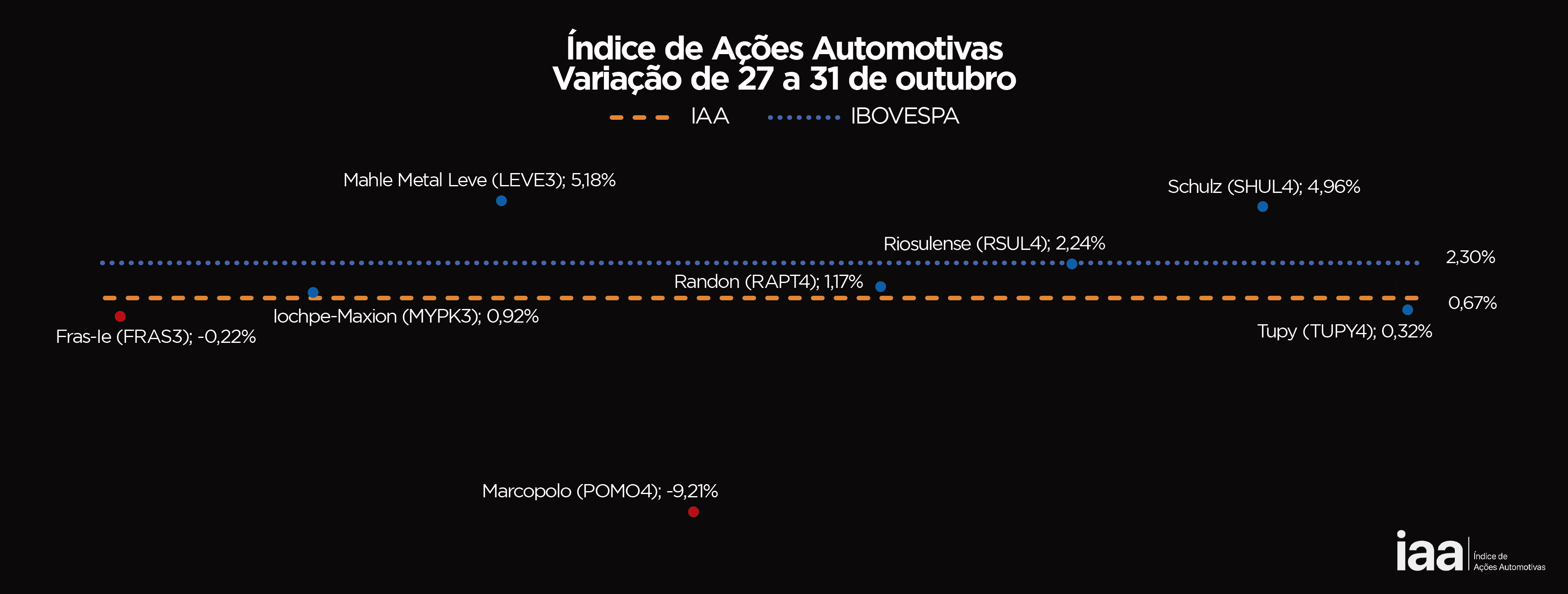 O desempenho semanal do IAA,+0,67%, sofreu o impacto da desvalorização nas ações da Marcopolo(POMO4) -9,21% e da Frasle (FRAS3) -0,22%. As demais empresas que compõem a carteira fecharam em alta: Mahle Metal Leve EVE3) +5,18%; Schulz (SHUL4)+4,96%; Riosulense (RSUL4) +2,24%; Randon (RAPT4) +1,17%; Iochpe-Maxion (MYPK3) +0,92% e Tupy(TUPY4) +0,32%.