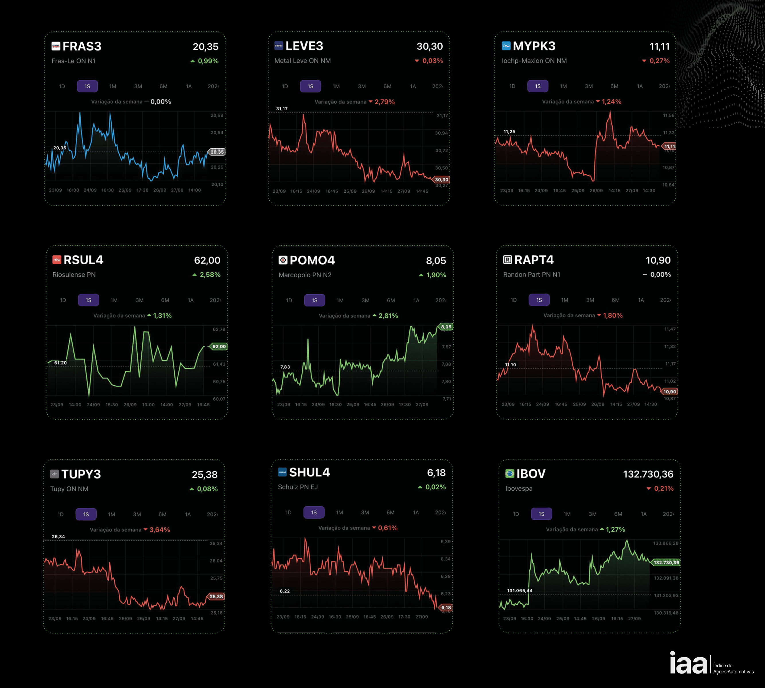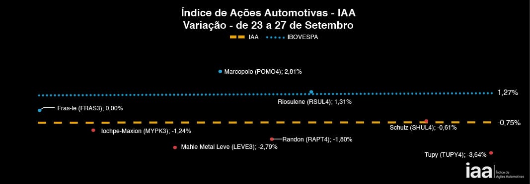 Com isso, a variação semanal do Ibovespa foi de +1,27%. Enquanto o IAA, índice que mede o desempenho das empresas automotivas na Bolsa foi de -0,75.