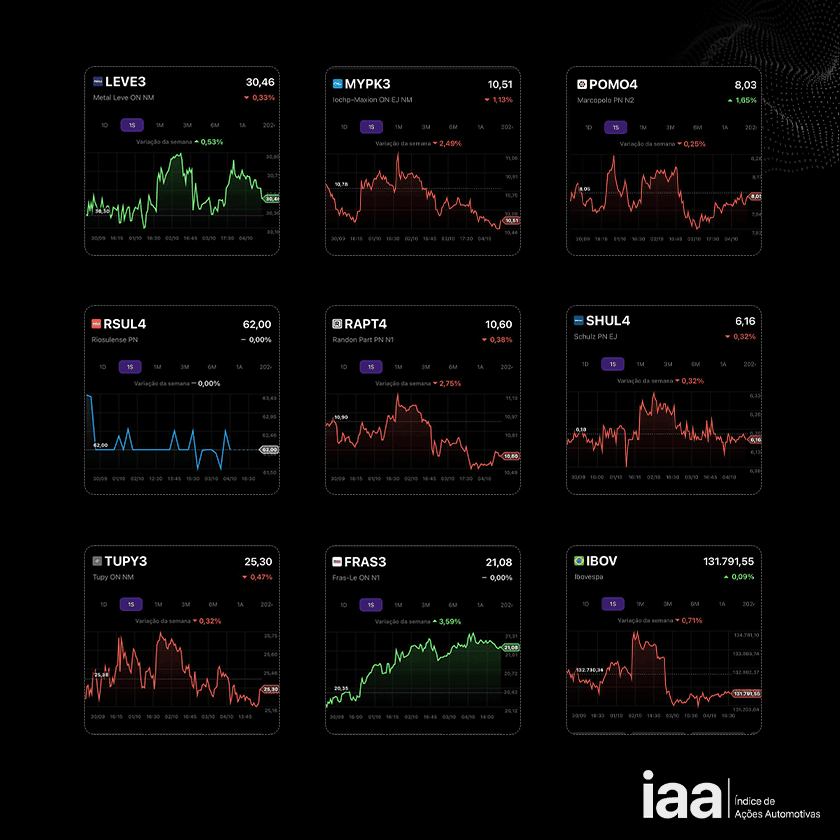 O IAA é o índice criado pelo After.Lab para medir as movimentações nas ações das empresas do setor automotivo listadas em Bolsa. Mesmo que ainda sejam poucas as empresas a operar nessa modalidade, já são suficientes para proporcionar uma leitura sobre o desempenho das operações relacionadas ao universo automotivo que abriram capital e usam o pregão do Ibovespa para conquistar investidores e alavancarem seus negócios.