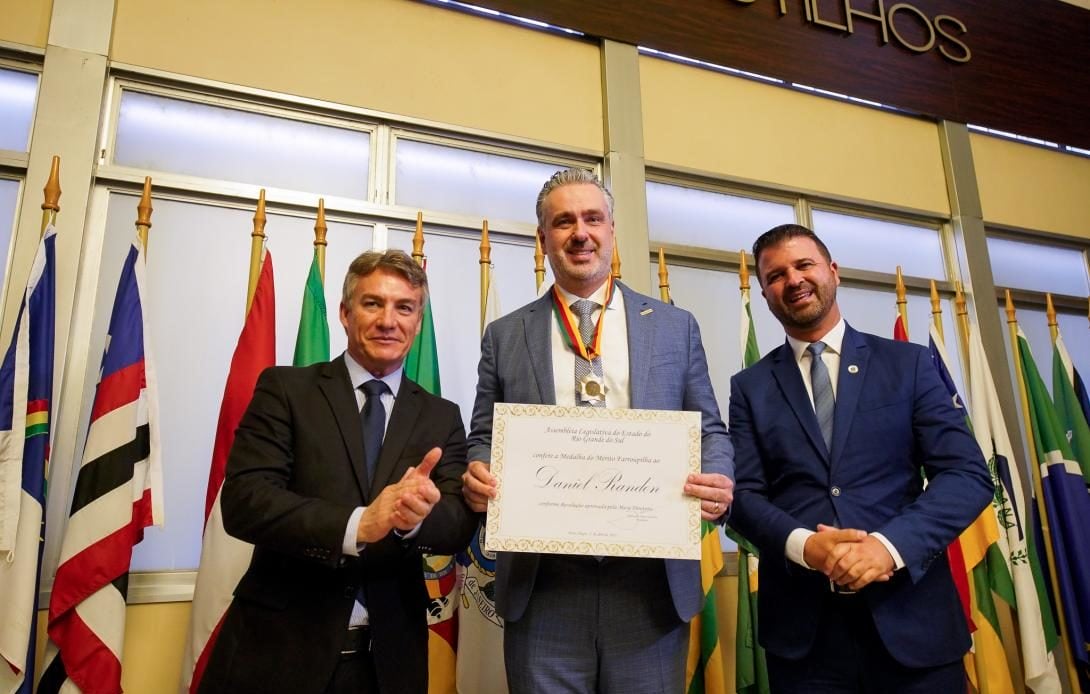 Em solenidade no Salão Júlio de Castilhos, o empresário Daniel Randon recebeu a Medalha do Mérito Farroupilha por sua trajetória empresarial, engajamento em projetos sociais e participação ativa em iniciativas que contribuem para a competitividade do RS. A medalha foi entregue pelo presidente da ALRS, deputado Vilmar Zanchin (MDB), e pelo deputado Neri, o Carteiro (PSDB), proponente da homenagem.