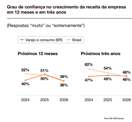 Logo no início, a pesquisa marca o tom de cautela que deve orientar o setor ao longo de 2026. Isso porque, tanto no recorte global quanto no doméstico, os executivos se mostraram menos confiantes quanto à capacidade de suas empresas aumentarem as receitas, seja ao longo deste ano ou no acumulado do próximo triênio.