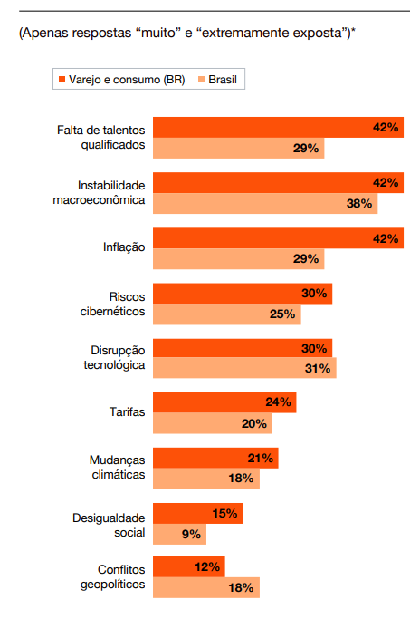De acordo com o estudo, três grandes riscos dominaram a agenda menos confiante e mais defensiva: a instabilidade macroeconômica, a inflação e a escassez de talentos. Logo atrás desses fatores, historicamente familiares na avaliação de risco do empresariado brasileiro, está um componente crescente: as preocupações quanto aos riscos cibernéticos e a disrupção tecnológica.