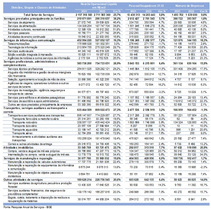Com base em dados referentes à receita operacional líquida e aos números de empresas ativas e de empregos gerados, estudo da Federação do Comércio de Bens, Serviços e Turismo do Estado de São Paulo (FecomercioSP) revela que o setor de Serviços não financeiros apresentou rápida recuperação no período pós-pandemia. A análise se baseou na Pesquisa Anual de Serviços (PAS) do IBGE, referente ao ano de 2022 (última disponível).