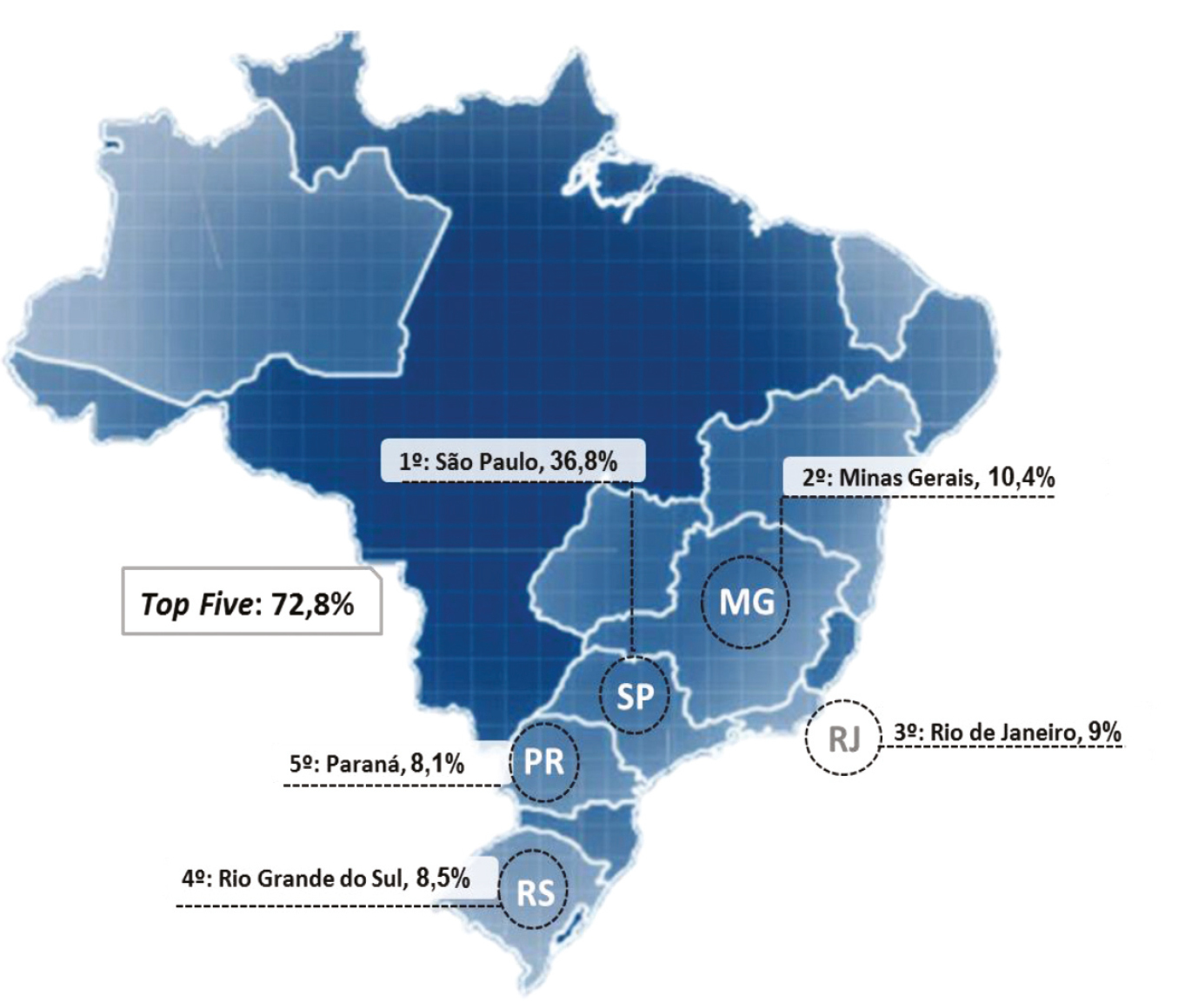 A frota brasileira está predominantemente concentrada em cinco estados: São Paulo, com 36,8% do total; Minas Gerais, 10,4%; Rio de Janeiro, 9,0%; Rio Grande do Sul, 8,5%; e Paraná, com 8,1%. Agregados, esses cinco Estados representam 72,8% de todos os autoveículos que transitam no país.