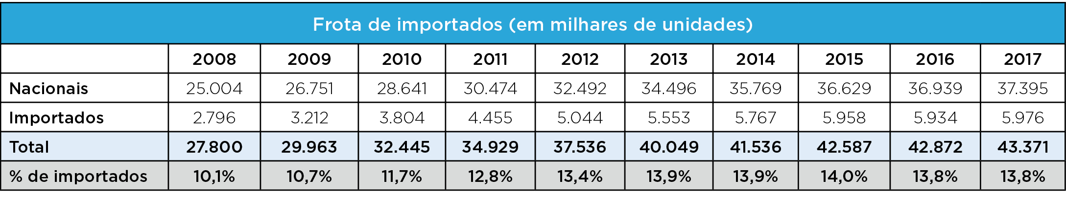 Da frota circulante de mais de 43 milhões de veículos, os importados participaram com 13,8% em 2017. Após período de intenso crescimento, cujo ápice foi alcançado em 2015, a participação recuou em 2016 e manteve-se estável no ano passado.