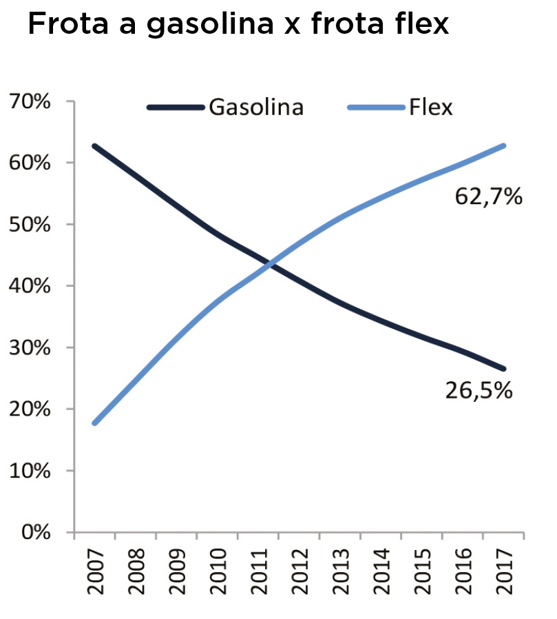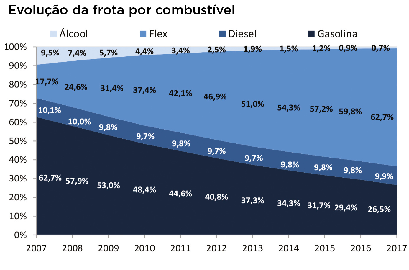 Em 2017, os veículos flex representaram aproximadamente 62,7% da frota total e os veículos a gasolina, 26,5%. Somadas, as duas categorias atingiram cerca de 90% dos automotores circulantes. A frota movida apenas a álcool diminuiu a cada ano e representou apenas 0,7% do total em 2017. Por sua vez, os autoveículos a diesel, ao alcançar 9,9% do total, praticamente mantiveram a participação observada em anos recentes. Autoveículos movidos a GNV, os tetrafuel e os híbridos elétricos não estão presentes nas informações utilizadas, por terem participação inexpressiva.
