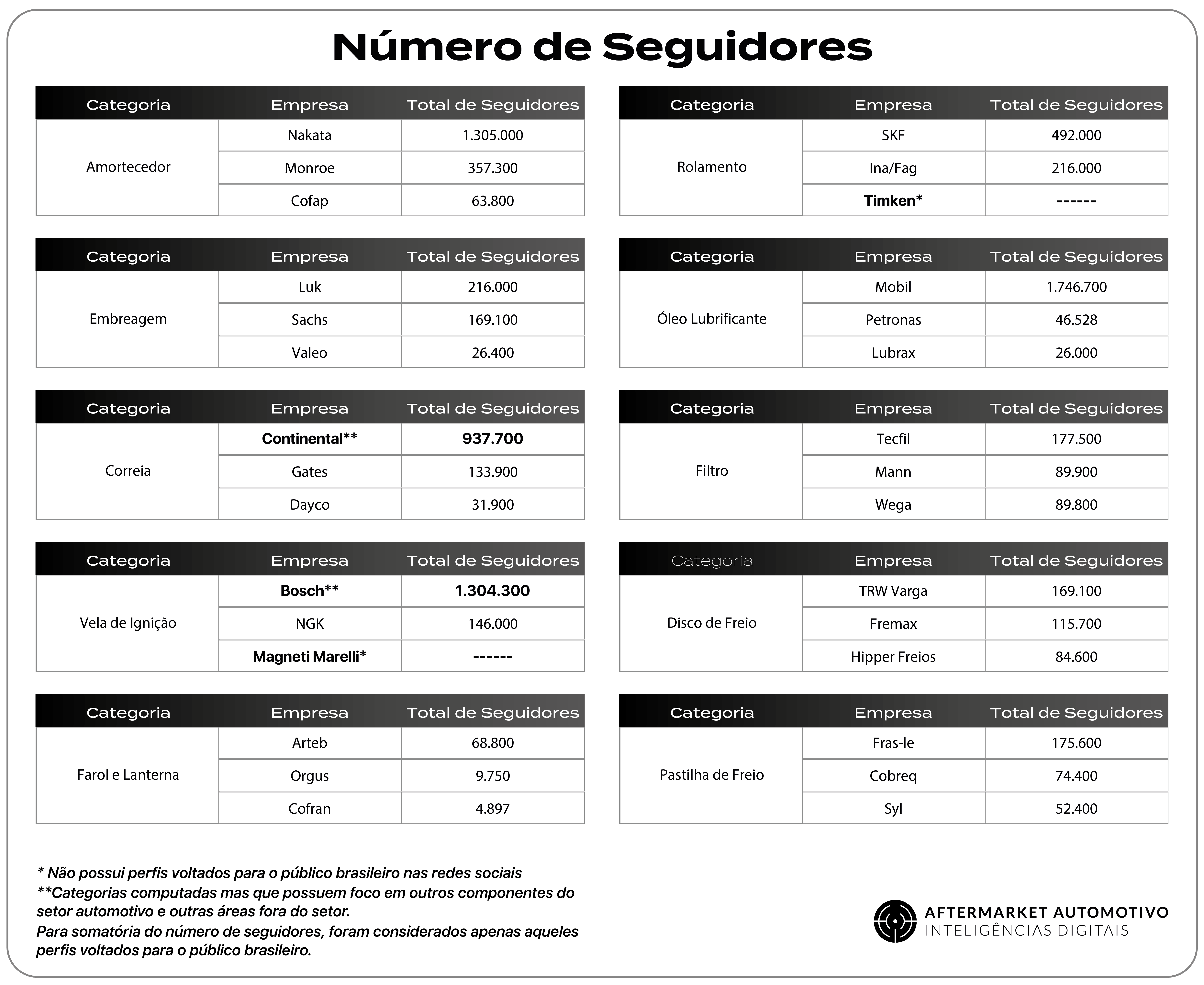 No caso específico dos distribuidores, a Prêmio Aftermarket Automotivo – Inteligência Digital apurou o número total de seguidores que cada empresa tinha conquistado em dezembro de 2025 na somatória das plataformas Facebook, Instagram e Linkedin.