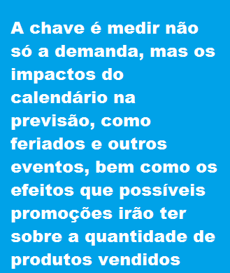 CH A maioria dos nossos clientes de varejo está interessada em evitar qualquer tipo de perda de vendas, o que significa que o produto deve estar disponível na quantidade exata no ponto de venda, pois, caso contrário, o cliente irá comprar no concorrente. A chave é medir não só a demanda, mas os impactos do calendário na previsão, como feriados e outros eventos, bem como os efeitos que possíveis promoções irão ter sobre a quantidade de produtos vendidos.