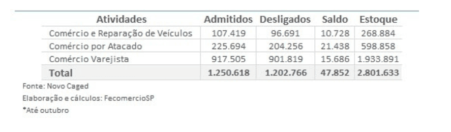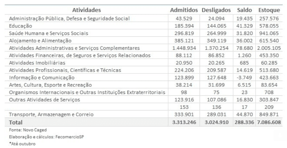 Entre os meses de janeiro e outubro, os Serviços e o Comércio do Estado de São Paulo abriram cerca de 336 mil novas vagas de trabalho com carteira assinada. Dados elaborados pela Federação do Comércio de Bens, Serviços e Turismo do Estado de São Paulo (FecomercioSP) com base no Cadastro Geral de Empregados e Desempregados (Caged) mostram que, no primeiro caso, o saldo foi de 288,3 mil postos de trabalho. No segundo, esse número foi de 47,8 mil [tabelas 1 e 2].