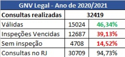 Cerca de 39% dos veículos pesquisados estavam com a inspeção veicular periódica vencida. Além disso, outros 15% não tinham nenhuma inspeção registrada. 95% dos veículos pesquisados foram no Estado do RJ. A pesquisa foi realizada com recurso das associações que fazem parte da FENIVE, utilizando o banco de dados dos organismos de inspeção através do aplicativo GNV Legal, desenvolvido pelo grupo Otimiza, que fornece sistemas para as empresas (planilha anexa). Em outros estados, o índice de veículos irregulares passa de 40%, como em Minas Gerais e Paraná, por exemplo.