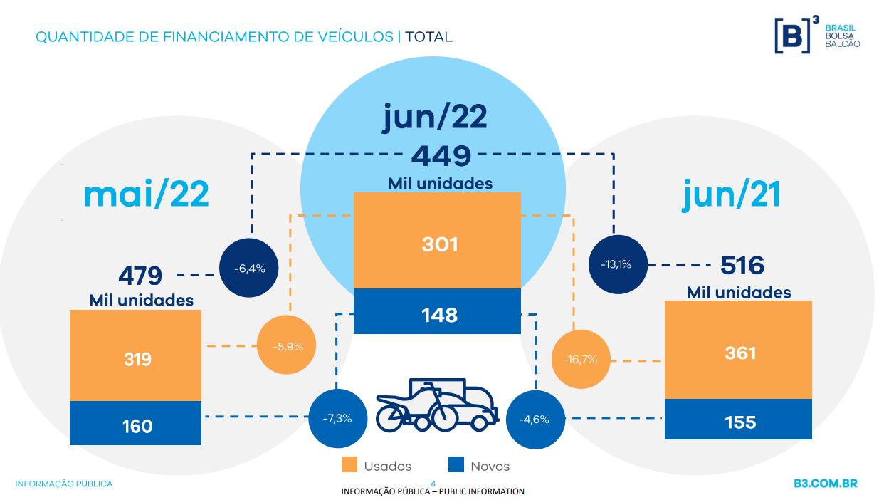As vendas financiadas de veículos em junho de 2022 somaram 449 mil unidades, entre novos e usados, de acordo com dados da B3. O número, que inclui autos leves, motos e pesados em todo o país, representa queda de 6,4% se comparado a maio de 2022, quando os financiamentos de veículos somaram 479 mil unidades. Em comparação com junho de 2021, foi registrado recuo de 13,1%.