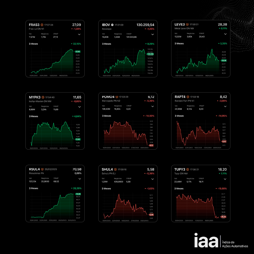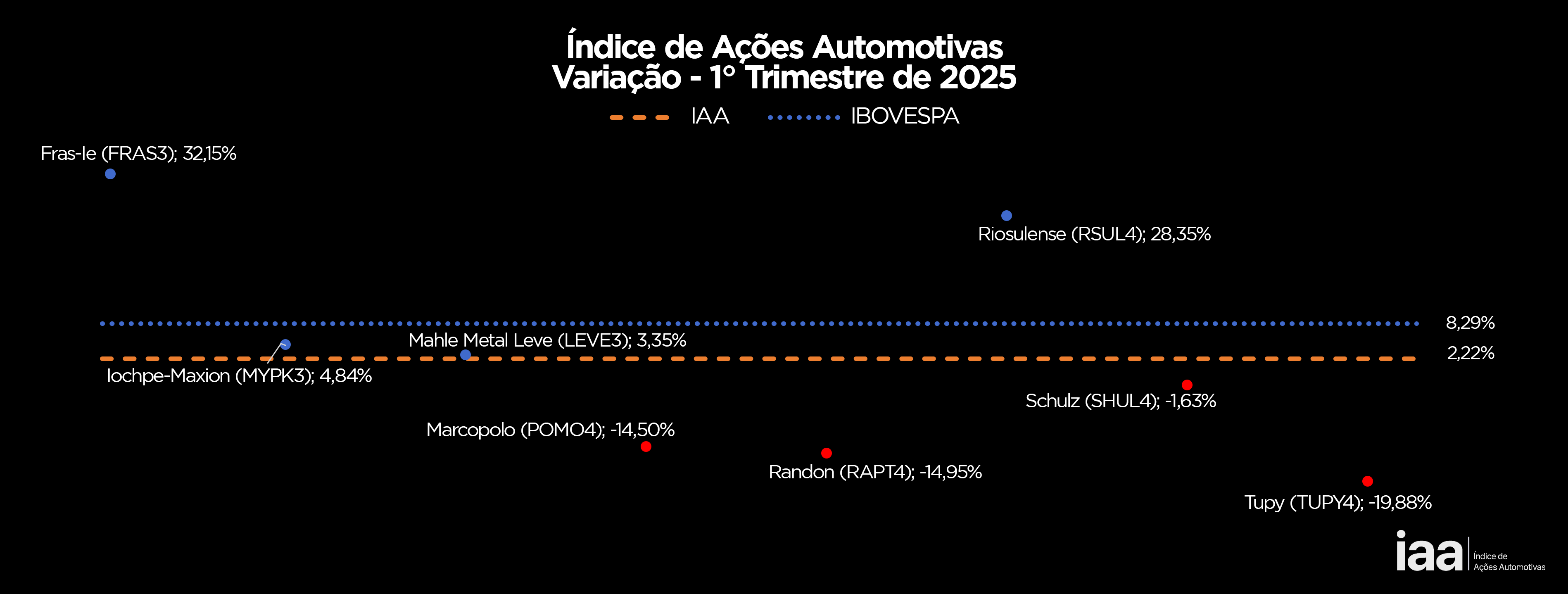 O IAA, índice que mede o desempenho das ações automotivas na Bolsa de Valores de São Paulo, encerrou o primeiro trimestre de 2025 com variação positiva de +2,22%. Enquanto o Ibovespa ficou em +8,29%.