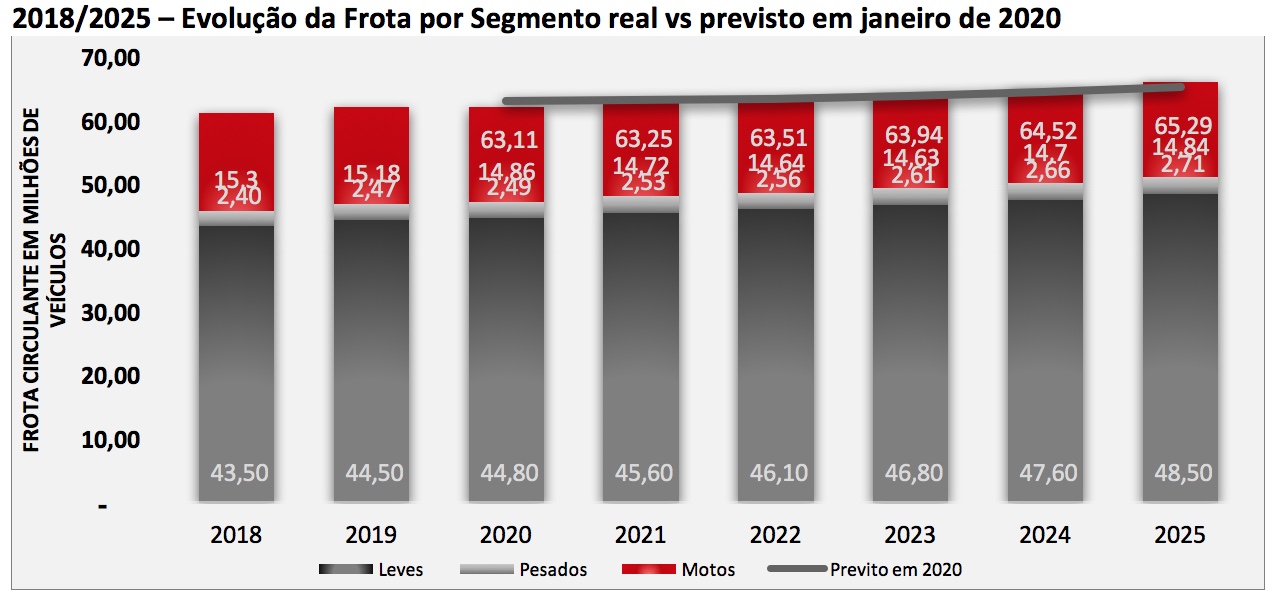 Entretanto, como se previu à época, o mercado de reposição no que tange à demanda teve uma recuperação em “V” e conseguiu manter sua liquidez com a valorização dos estoques existentes em um cenário de baixo índice de abastecimento pelo lado da indústria. A dinâmica impetuosa entre oferta (falta de abastecimento) e procura (mercado se recuperando em V) valorizou os estoques tanto no atacado como no varejo e com essa importante recomposição de margens a grande maioria dos agentes comerciais fechou suas contas com liquidez. Com o contorno da crise no curto prazo, algumas questões se apresentaram, ainda com respostas turvas em relação ao futuro do setor. Quais serão os efeitos da pandemia em longo prazo? Como se comportará o mercado frente às complexidades na formação do mix de produtos, quais serão os desafios tecnológicos? Do ponto de vista mercadológico, a frota sofrera uma redução de curto prazo nas taxas de crescimento previstas anteriormente, o que também no curto prazo tende a reduzir as taxas de crescimento vegetativo do setor, que apesar disto se manterão positivas. Até dezembro de 2021 haverá uma redução de 440.000 veículos em circulação em relação ao que fora previsto em janeiro de 2020 (antes da pandemia), isto em função do baixo desempenho nas vendas de veículos novos realizado em 2020 aliado a uma queda de expectativas na atividade econômica do país. Entretanto, no acumulado até 2025, as previsões se mostram mais otimistas em relação ao período anterior à pandemia, com um saldo positivo de 760.000 veículos em circulação no Brasil em relação ao previsto anteriormente. Esta situação ocorrerá mais por melhorias na expectativa do mercado em relação à situação econômica do país do que propriamente por alguma mudança estrutural trazida pela pandemia, sejam elas positivas ou negativas.