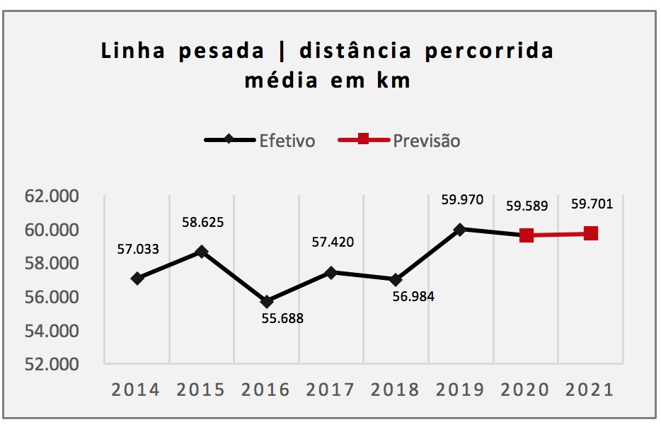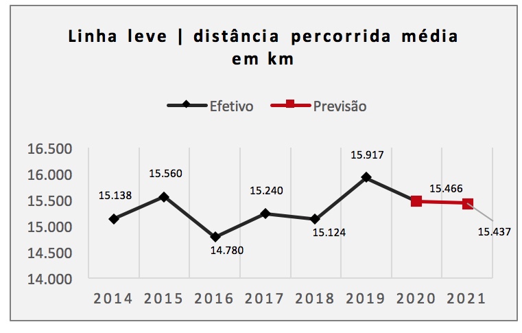 Em contrapartida ao crescimento da frota, os condutores de veículos deverão apresentar algumas oscilações na utilização de seus automóveis. Na linha leve nota-se uma ligeira queda na distância percorrida anual em decorrência do aumento da adesão do trabalho remoto (home office) e elevação nos preços de combustíveis. Já em relação à linha pesada espera-se uma recuperação na utilização de caminhões e veículos de transporte de carga, conforme gráficos abaixo;