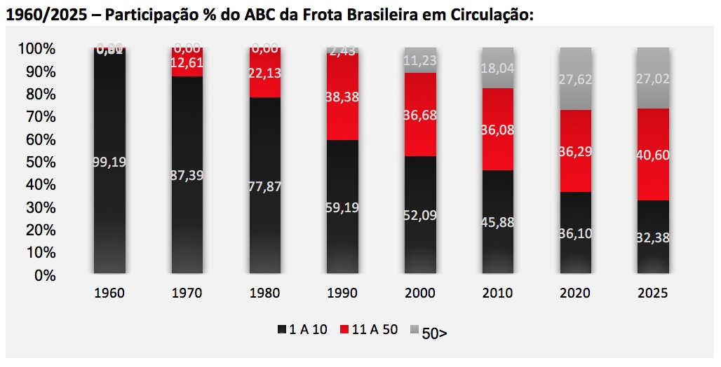 Em relação ao mix do parque em circulação o processo de pulverização da frota mantém sua tendência de crescimento. Atualmente são mais de 740 modelos de veículos em circulação divididos em mais de 22 mil versões distintas. Até o ano de 1990 os 10 veículos com maior volume em circulação no Brasil, representavam 59,19% do total da Frota. Em 2020, a mesma faixa de veículos representa apenas 36,10% do volume circulante. Já os veículos considerados “cauda longa”, ou seja, aqueles que ocupam acima da 51ª posição no ranking ABC da Frota representavam em 1990 apenas 2,43% do mercado, em 2020 esta faixa já soma 27,62% do total.