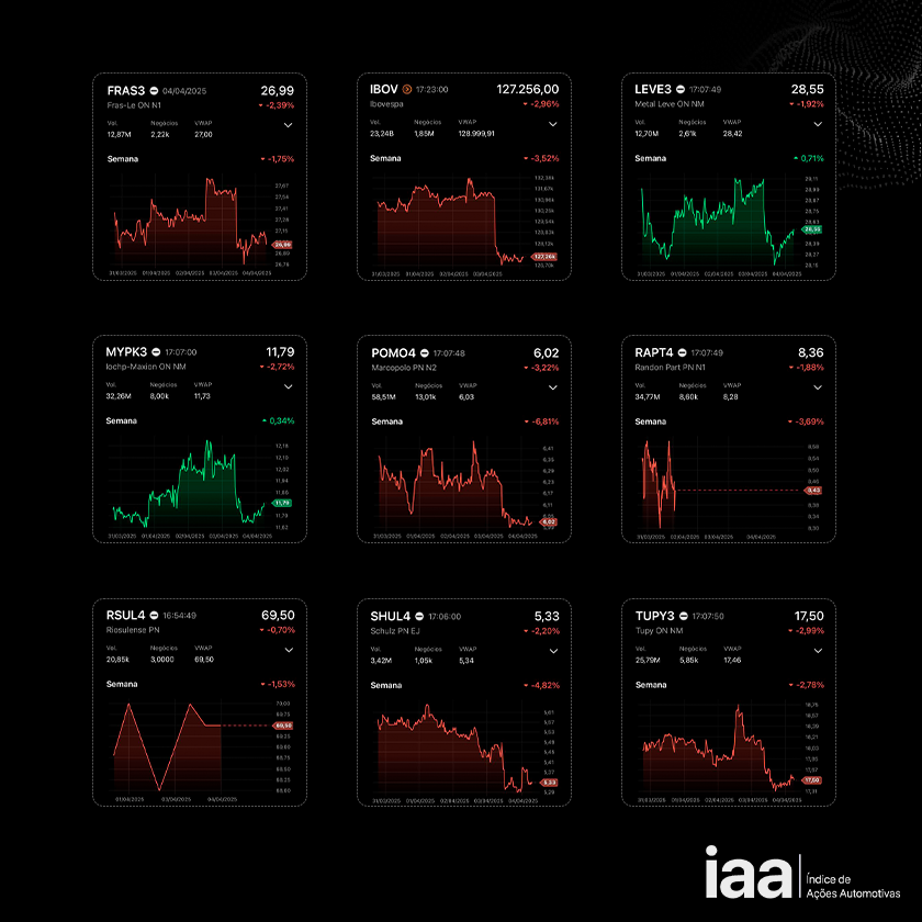 O IAA é o índice criado pelo After.Lab para medir as movimentações nas ações das empresas do setor automotivo listadas em Bolsa. Mesmo que ainda sejam poucas as empresas a operar nessa modalidade, já são suficientes para proporcionar uma leitura sobre o desempenho das operações relacionadas ao universo automotivo que abriram capital e usam o pregão do Ibovespa para conquistar investidores e alavancarem seus negócios.