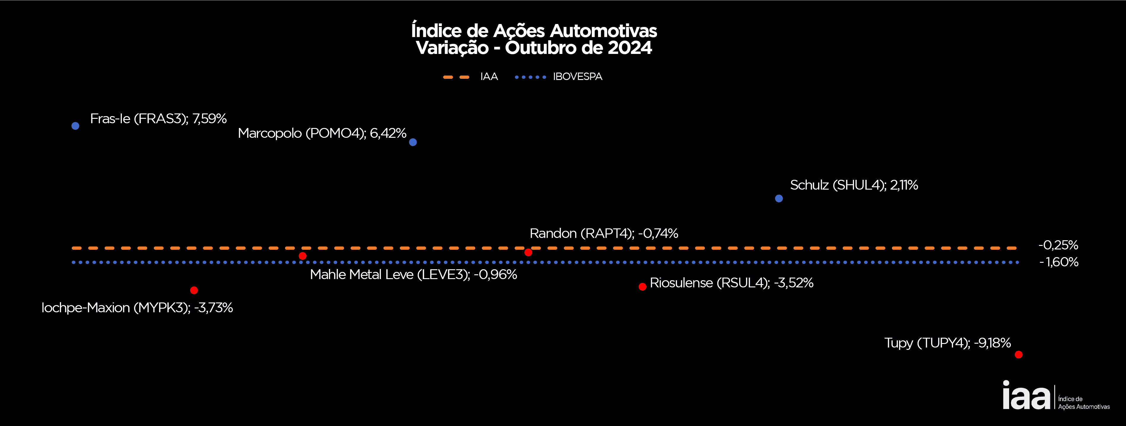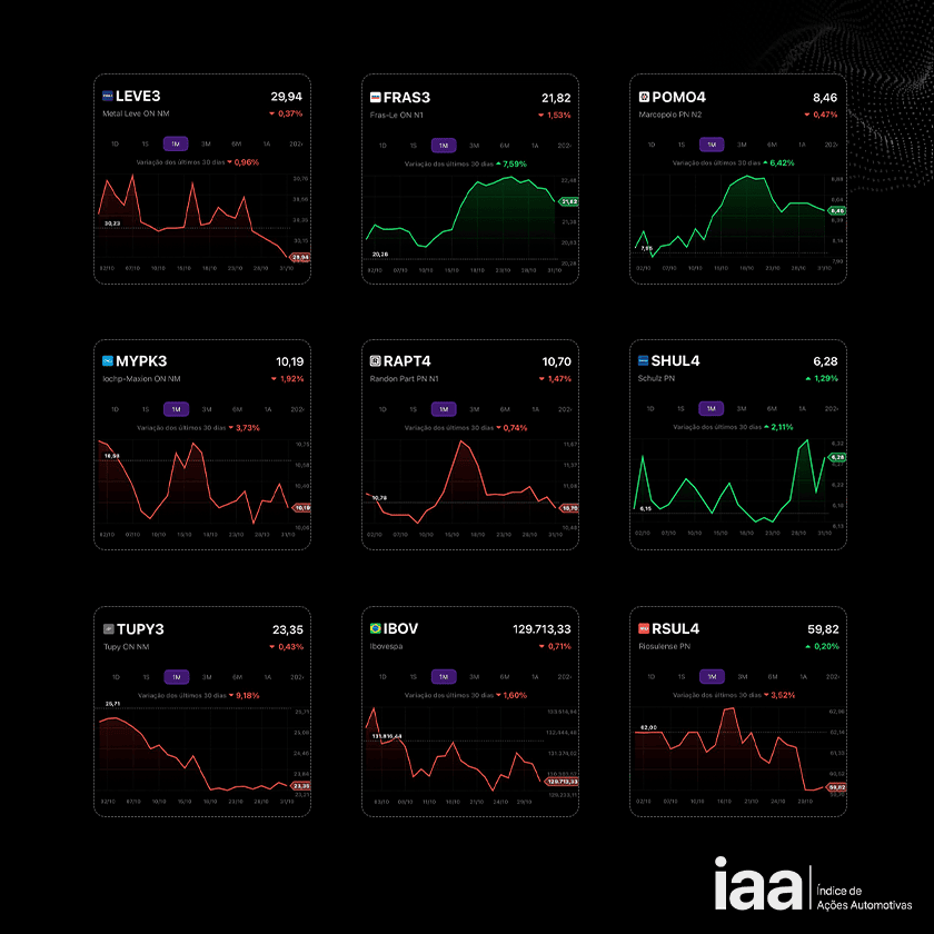 As altas registradas pelas ações da Fras-le (FRAS3) +7,59%; Marcopolo (POMO4) +6,42%; Schulz (SHUL4) +2,11% não foram suficiente para alterar o resultado mensal do IAA, já que as demais ações encerraram outubro em queda: Randon (RAPT4) -0,74%; período: Mahle Metal Leve (LEVE3) -0,96%; Riossulense (RSUL4) -3,52%; ; Iochpe-Maxion (MYPK3) –3,73% e Tupy (TUPY4)-9,18%.