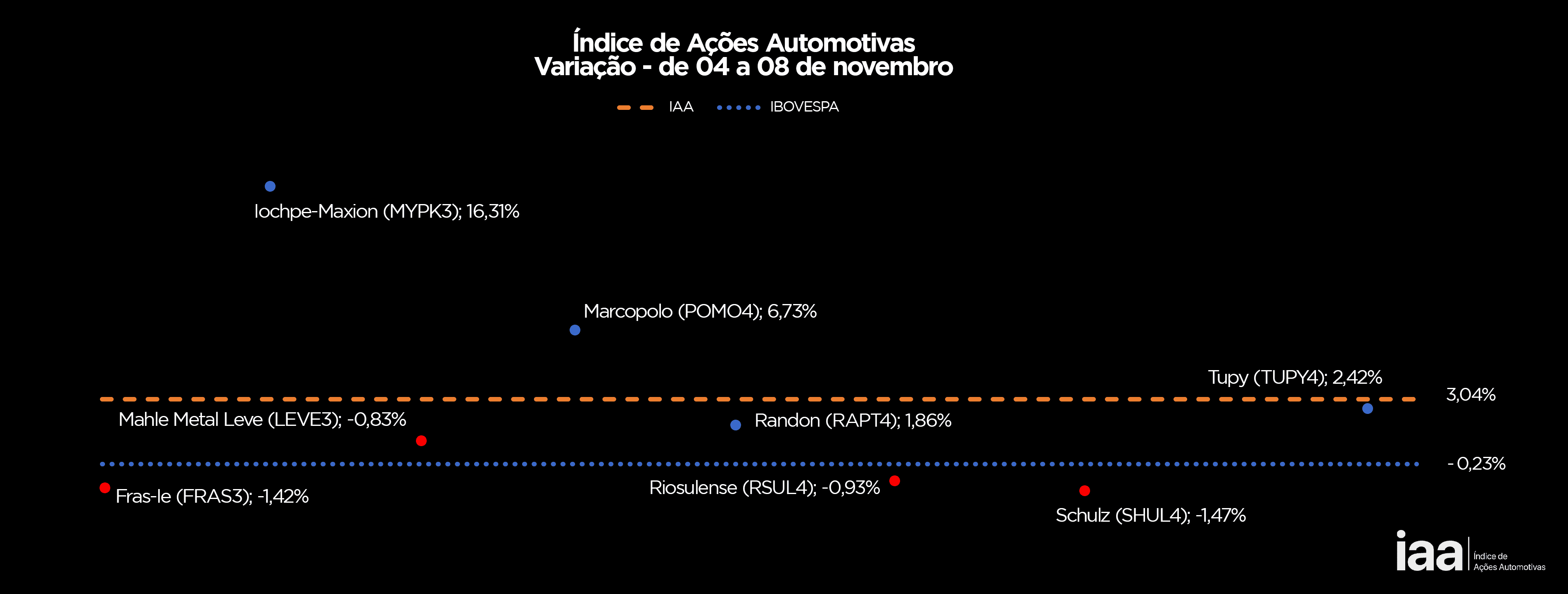 Entre as ações automotivas, o destaque foi da Iochpe-Maxion (MYPK3) que registrou um crescimento semanal de 16,31%. Marcopolo (POMO4) +6,73%; Tupy (TUPY4) 2,42% Randon (RAPT4) +1,86% e Mahle Metal Leve (LEVE3) +0,83% também encerraram o período com variações positivas.