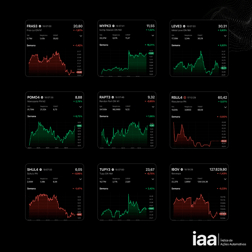 O IAA é o índice criado pelo After.Lab para medir as movimentações nas ações das empresas do setor automotivo listadas em Bolsa. Mesmo que ainda sejam poucas as empresas a operar nessa modalidade, já são suficientes para proporcionar uma leitura sobre o desempenho das operações relacionadas ao universo automotivo que abriram capital e usam o pregão do Ibovespa para conquistar investidores e alavancarem seus negócios.