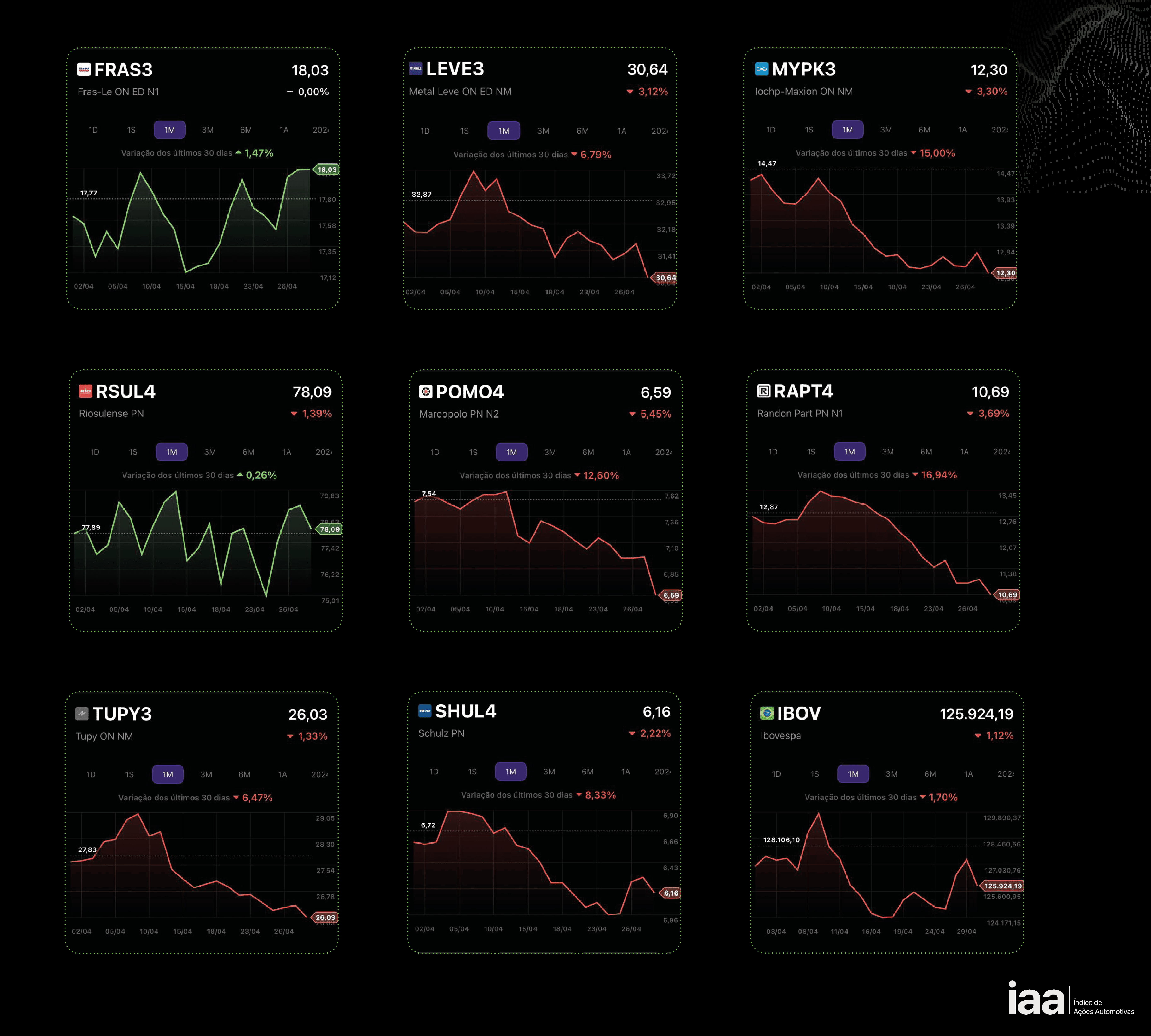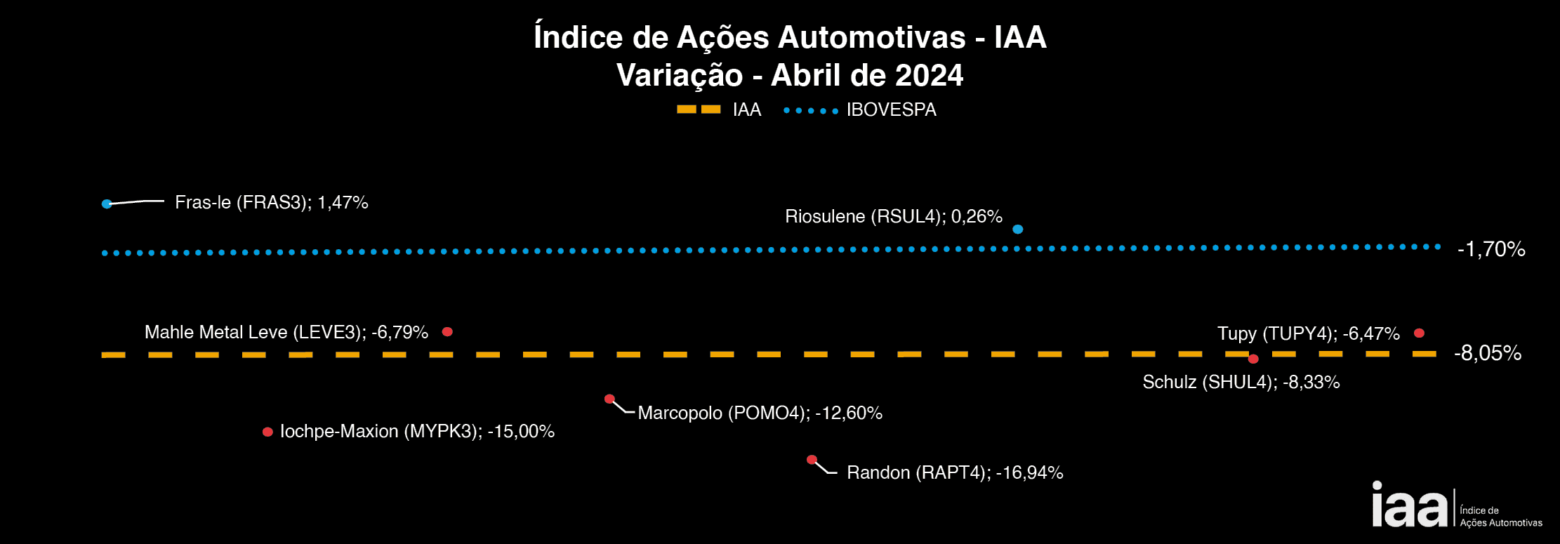Em abril, as ações automotivas, negociadas na Bolsa de Valores de São Paulo, registraram sucessivas quedas. O IAA, índice que mede o desempenho desses títulos, encerrou o mês com uma desvalorização de -8,05%.