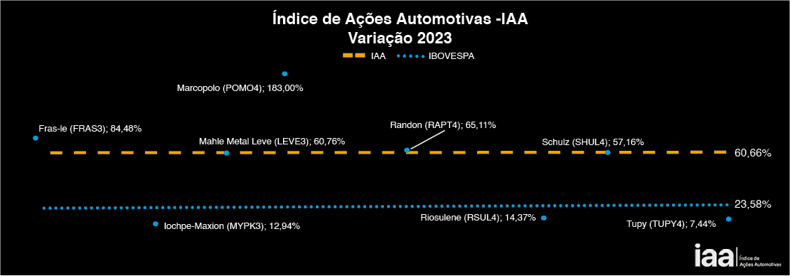 O bom desempenho das ações automotivas negociadas na Bolsa de Valores de São Paulo levou o IAA a encerrar 2023 com variação positiva de 60,66%, superando o Ibovespa que registrou 23,58% ao término do ano.