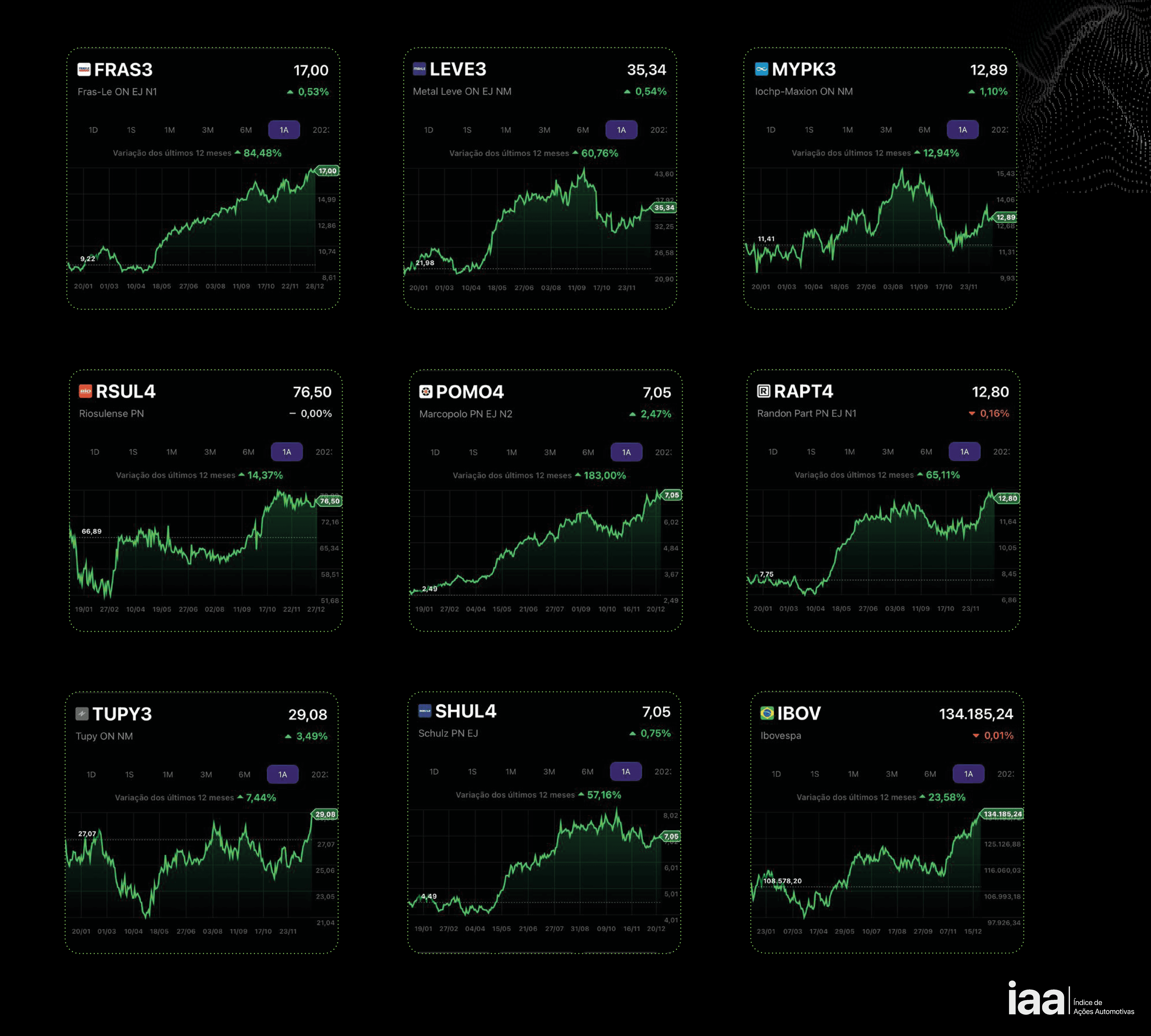 O IAA é o novo índice criado pela Plataforma Automotiva para medir movimentações nas ações do segmento listadas em Bolsa. Mesmo que ainda sejam poucas as empresas a operar nessa modalidade, já são suficientes para proporcionar uma leitura sobre o desempenho das operações relacionadas ao universo automotivo que abriram capital e usam o pregão do Ibovespa para conquistar investidores e alavancarem seus negócios.