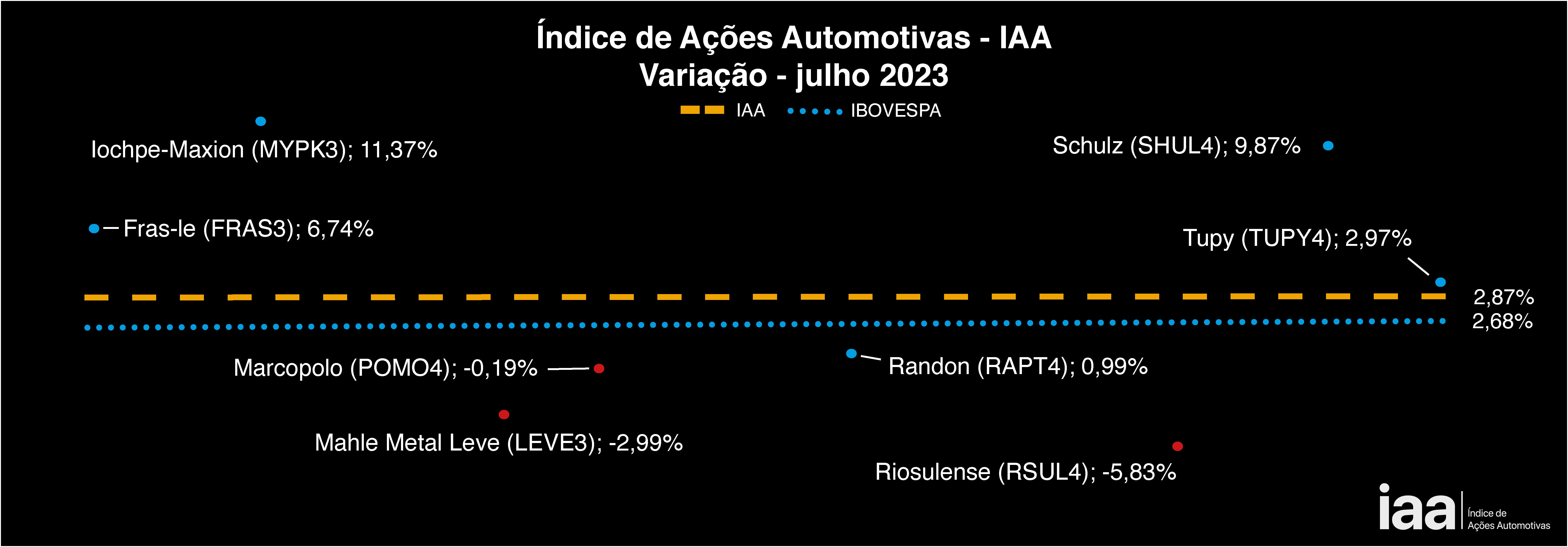 Apesar das altas e baixas registradas no mercado de ações no mês de julho, o IAA, índice que mede as ações automotivas negociadas na Bolsa de Valores de São Paulo, encerrou o período com desempenho positivo de 2,87%, superando o resultado do iBovespa 2,68%.
