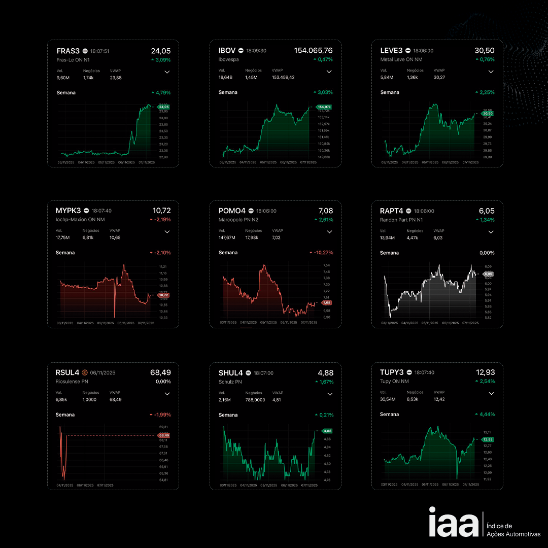 O IAA é o índice criado pelo After.Lab para medir as movimentações nas ações das empresas do setor automotivo listadas em Bolsa. Mesmo que ainda sejam poucas as empresas a operar nessa modalidade, já são suficientes para proporcionar uma leitura sobre o desempenho das operações relacionadas ao universo automotivo que abriram capital e usam o pregão do Ibovespa para conquistar investidores e alavancarem seus negócios.