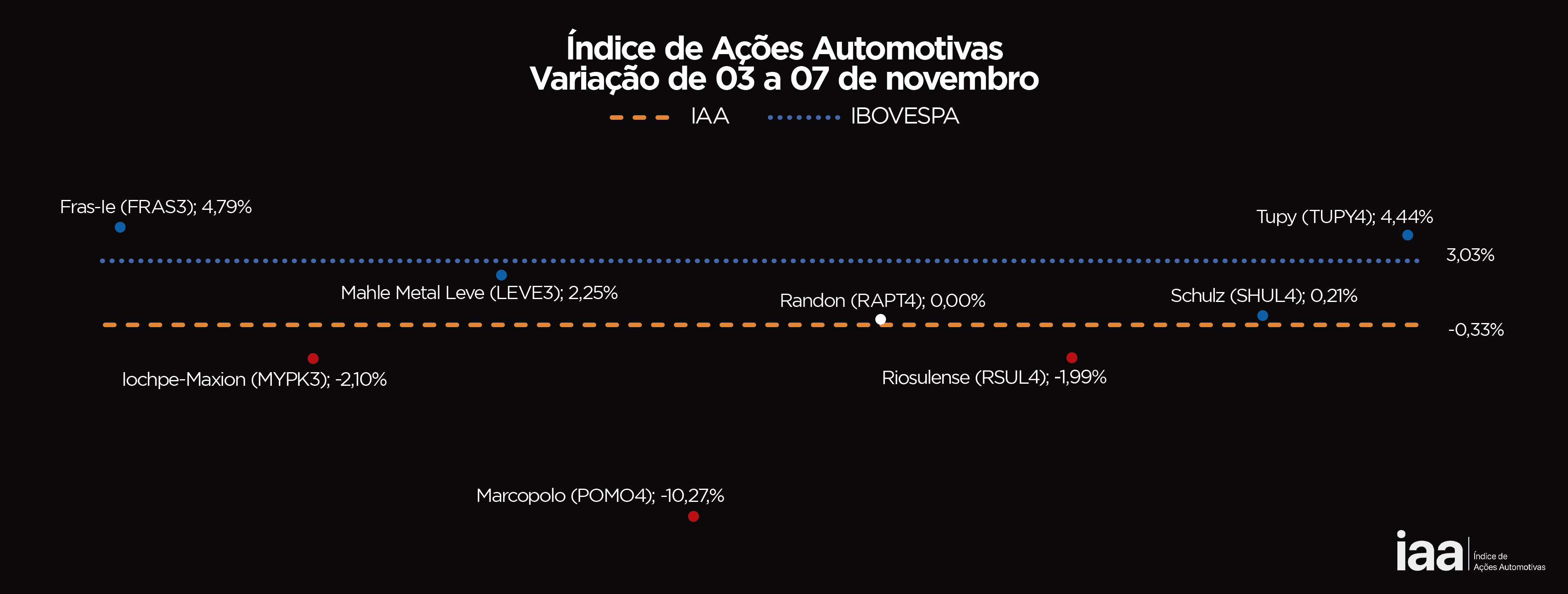 Ainda que Fras-le (FRAS3) +4,79%; Tupy(TUPY4) +4,44%; Mahle Metal Leve EVE3) +2,25% e Schulz (SHUL4)+0,21% tenham fechado em alta, o resultado do IAA manteve-se negativo devido às quedas das ações da Marcopolo(POMO4) -10,27%; Iochpe-Maxion (MYPK3) -2,10% e Riosulense (RSUL4) -1,99%.
