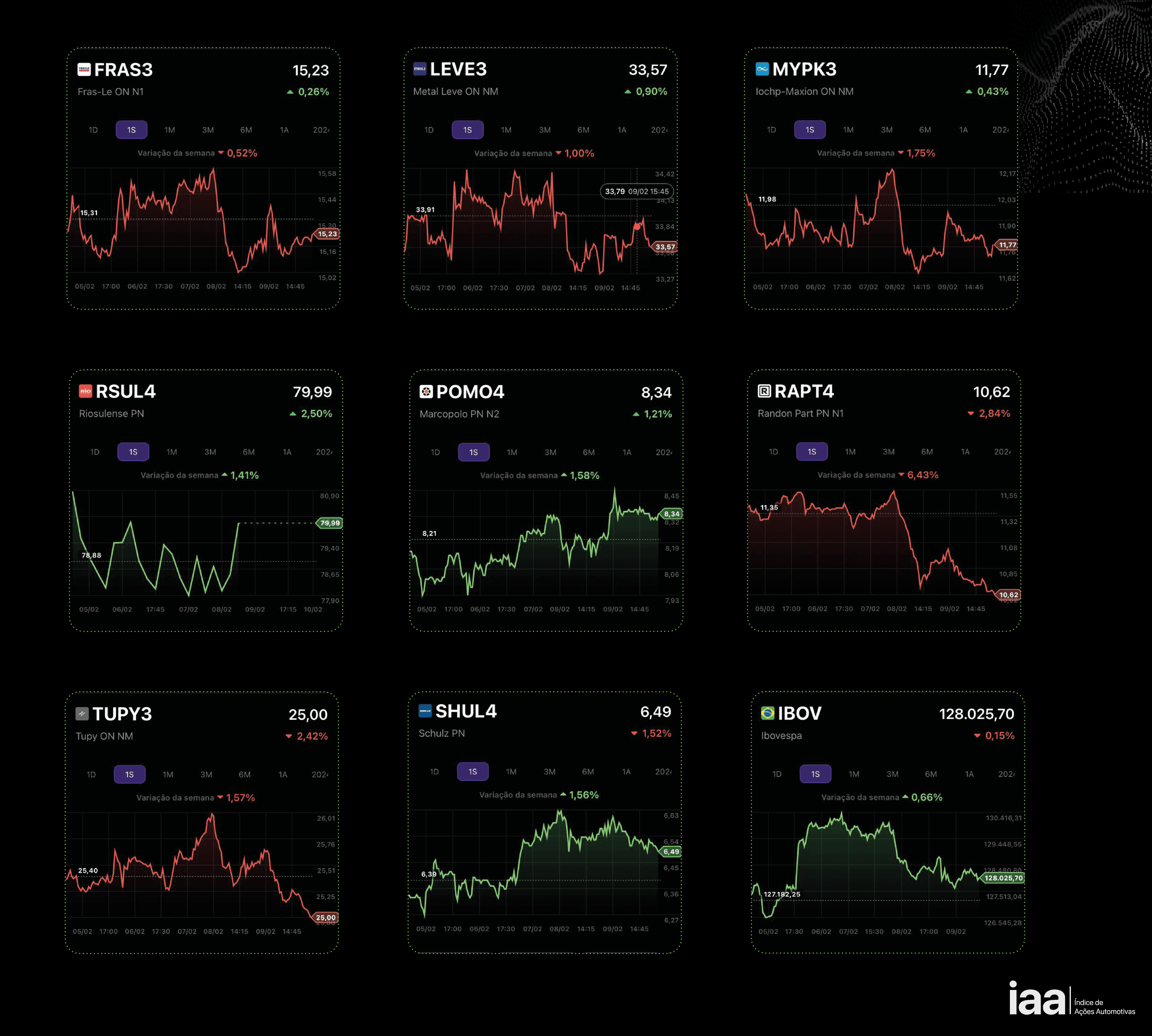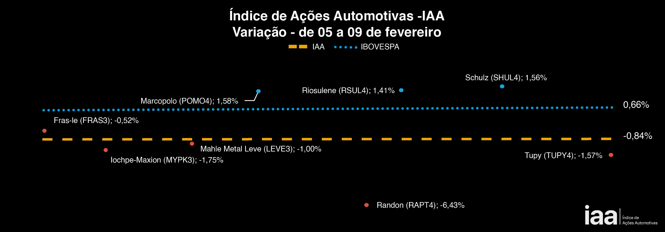 Apesar das ações negociadas na bolsa de valores de São Paulo registrarem uma leve reação positiva na semana de 05 a 09 de fevereiro levando ao fechamento do ibovespa em 0,66%, os ativos das empresas automotivas ainda permanecem no campo negativo. O IAA encerrou o período em -0.84%.