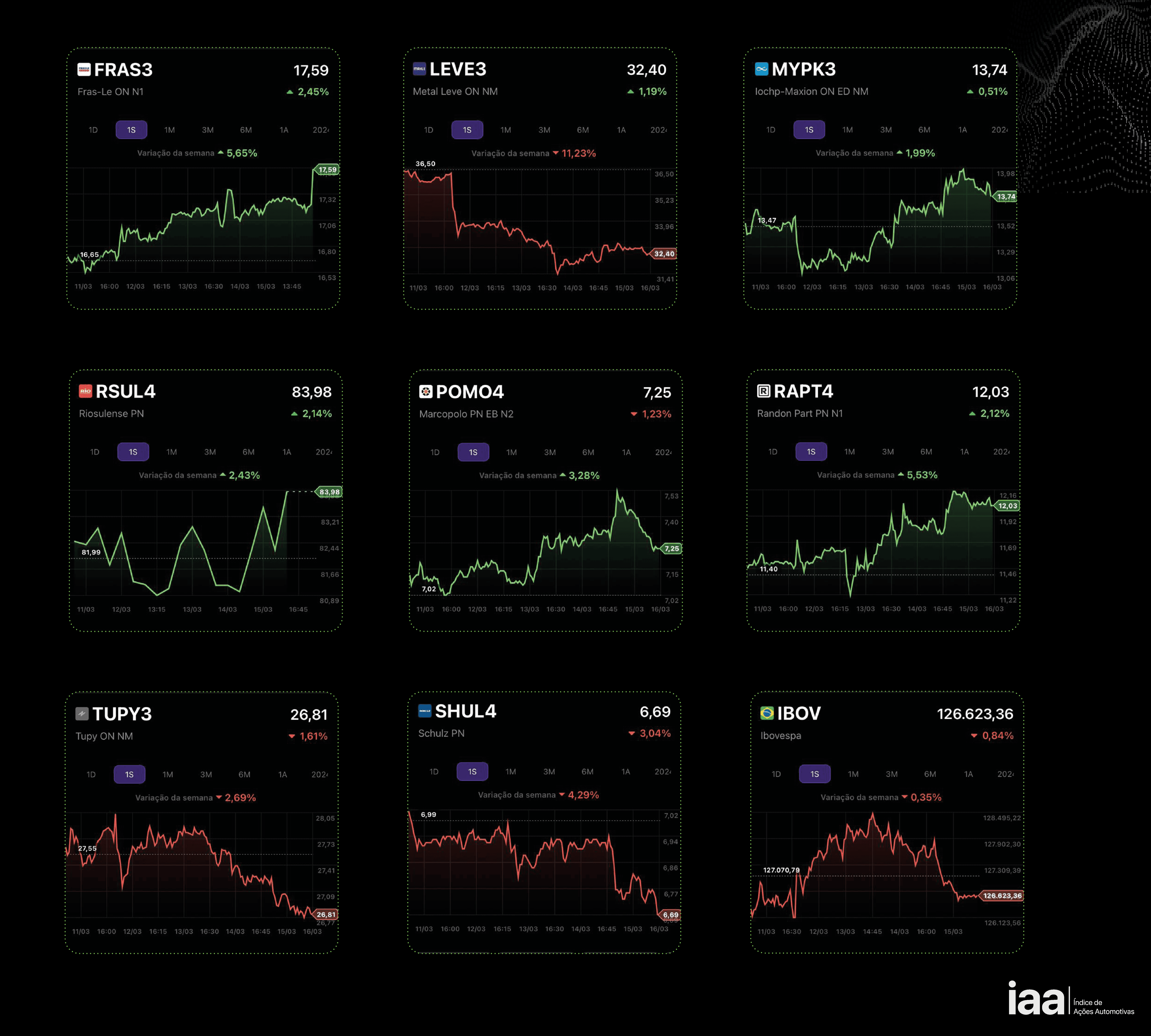 As ações da Mahle Metal Leve (LEVE3) -11,23%; Schulz (SHUL4) -4,29% e Tupy (TUPY4) -2,69% fecharam a semana em queda.